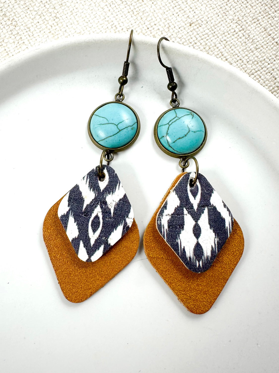 turquoise and leather earrings, adobe sky earrings, ikat print earrings, turquoise statement earrings, boho western earrings, southwest style earrings, genuine leather dangle earrings, 2.5 inch drop earrings, mixed material earrings, turquoise stone earrings, bold boho earrings, layered leather earrings, artisan style earrings, rustic chic earrings, southwestern fashion jewelry, everyday statement earrings, boutique turquoise earrings, cowgirl style earrings, western inspired earrings, bohemian drop earrings, tribal print earrings, earthy fashion accessories, lightweight statement earrings, gift for her earrings, turquoise and suede earrings, festival ready earrings, casual boho earrings, leather and stone earrings, desert vibes jewelry, trending boutique earrings