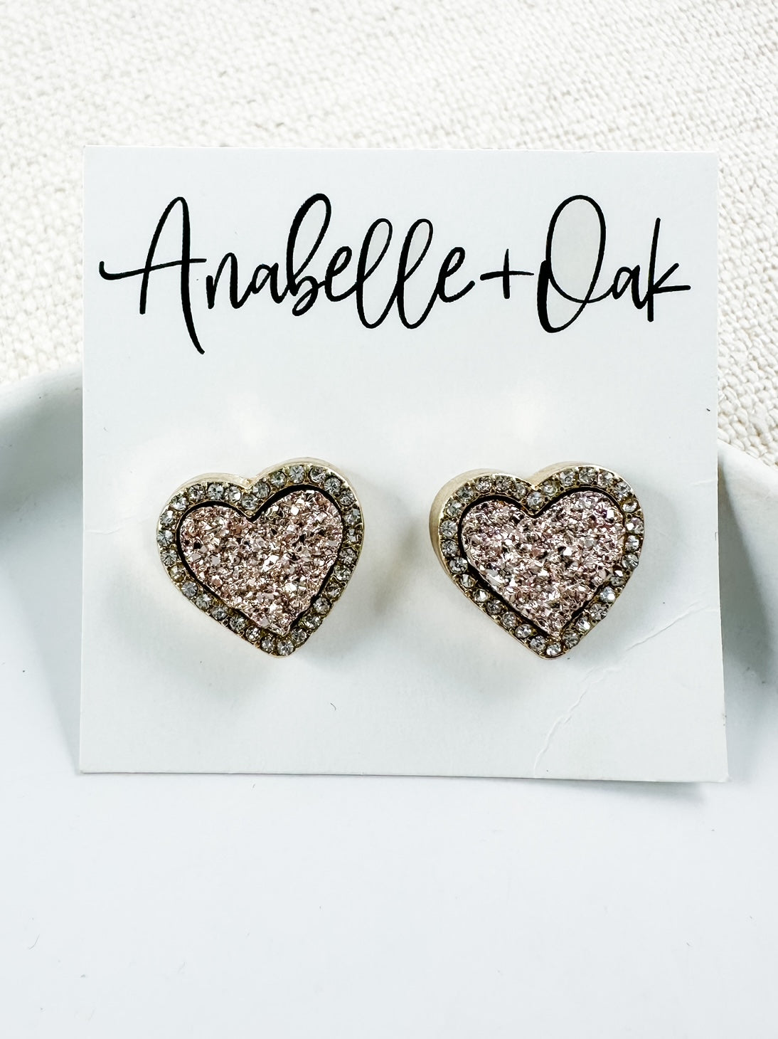 All My Love Studs, rose gold druzy studs, heart-shaped earrings, statement studs, rose gold earrings, glitter earrings, druzy jewelry, romantic earrings, lightweight earrings, trendy stud earrings, elegant heart earrings, Valentine’s Day gift, anniversary gift, birthday gift, bridal jewelry, wedding guest earrings, chic rose gold studs, gift for her, glamorous earrings, party jewelry, holiday gift, sophisticated earrings, versatile earrings, everyday glam earrings, sparkling studs, unique heart jewelry, affordable luxury earrings, curated accessories, romantic gift idea, stylish rose gold jewelry, delicate heart earrings, statement jewelry, rose gold accessories, timeless earrings, druzy statement studs.