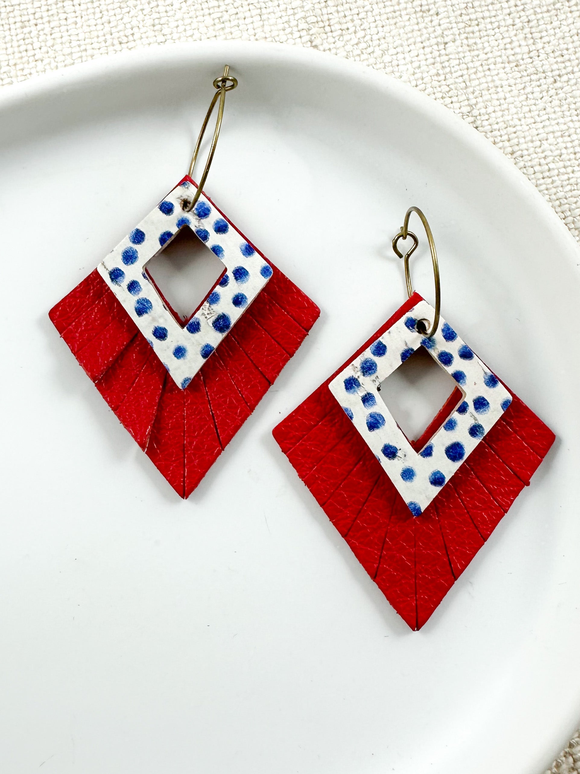 americana luxe earrings, red white and blue earrings, patriotic statement earrings, handmade leather earrings, cork dangle earrings, convertible hoop earrings, mix and match earrings, bold fringe earrings, lightweight earrings, americana jewelry, western-inspired earrings, rustic chic earrings, boho patriotic earrings, polka dot earrings, geometric drop earrings, statement hoop earrings, game day earrings, team spirit earrings, stylish fan gear, sporty chic earrings, tailgate accessories, festival fashion earrings, summer statement earrings, 4th of july earrings, memorial day jewelry, labor day earrings, rodeo fashion earrings, country concert earrings, gift for her, birthday jewelry, anniversary gift, handcrafted artisan earrings, trendy boho glam earrings, bold color accessories, modern cowgirl earrings, high-impact patriotic earrings, standout summer earrings, elevated americana style, trendy statement earrings, chic party earrings, fireworks night accessories, holiday-ready jewelry, must-have summer earrings