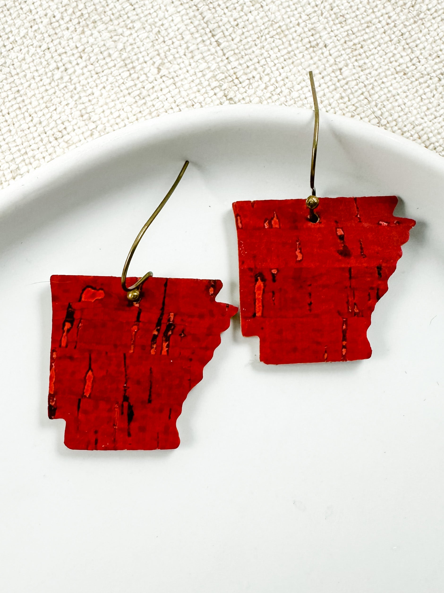 Arkansas shaped earrings, red Arkansas earrings, small state earrings, cork and leather earrings, handmade Arkansas jewelry, lightweight red earrings, earrings for sports fans, Arkansas fan earrings, boutique earrings for game day, genuine leather earrings, red game day earrings, state pride earrings, Arkansas outline earrings, red drop earrings, earrings for baseball moms, football fan earrings, handmade cork earrings, earrings for southern women, gift for Arkansas girl, sports mom earrings, red statement earrings, local team earrings, earrings for tailgate outfit, cute state earrings, Arkansas themed gift, minimalist sports earrings, small bold earrings, red leather earrings, unique state earrings, southern boutique jewelry