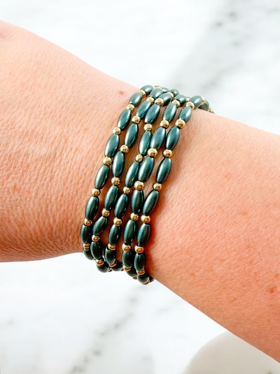 aurora wrap bracelet set, green beaded stretch bracelet set, forest green rice bead bracelet, dark teal pearlized beaded bracelet, layered beaded bracelet stack, gold accent bead bracelet set, green and gold bracelet set, 5 piece beaded bracelet set, stretchy rice bead bracelets, pearlized green bracelet stack, adjustable beaded bracelet stack, elegant green bead jewelry, fall transition bracelet, holiday bracelet gift, party ready bracelet stack, modern stacking bracelets, trendy rice bead jewelry, gift for bracelet lovers, layered green and gold bracelet, dark green stacking bracelets
