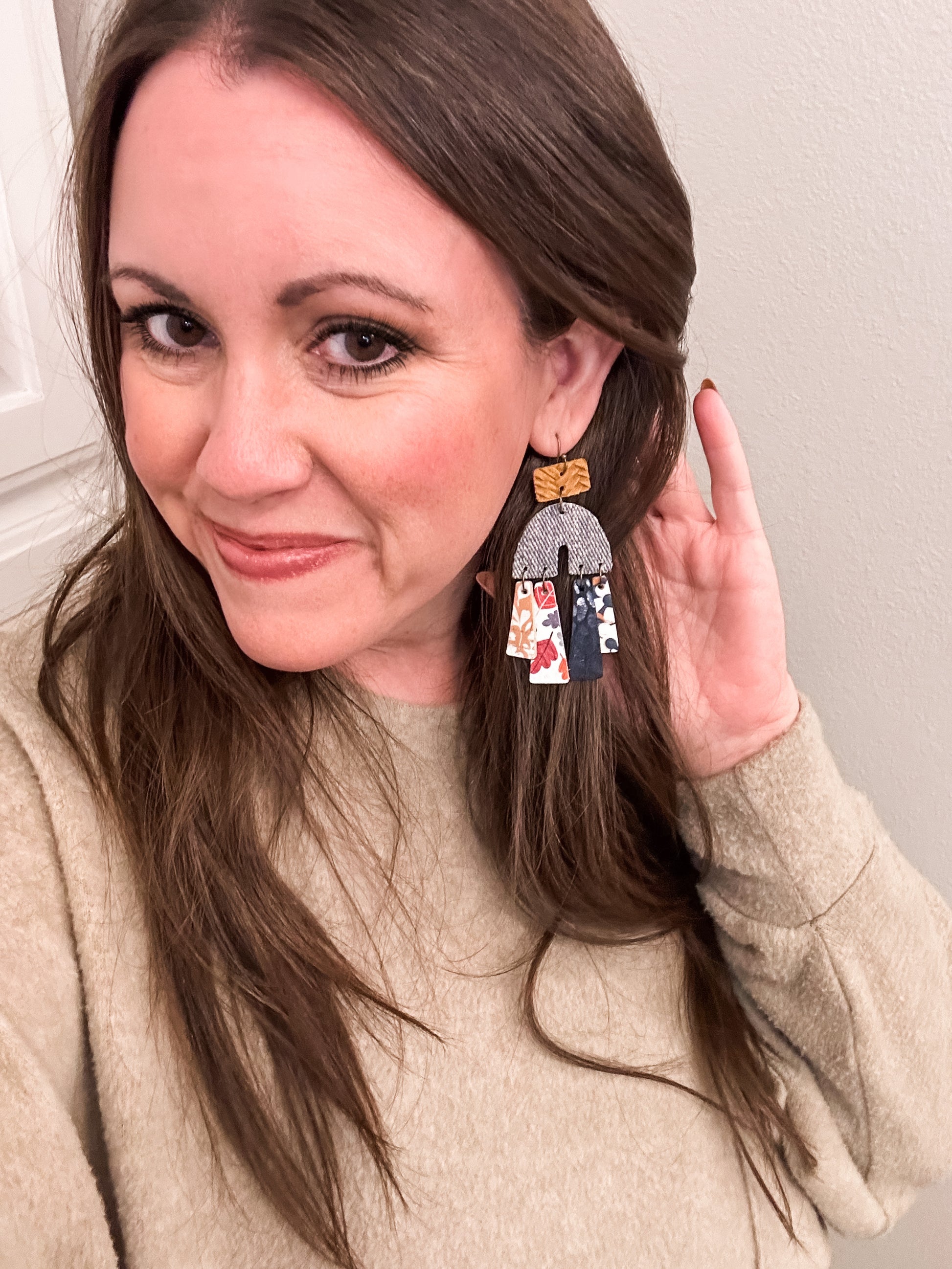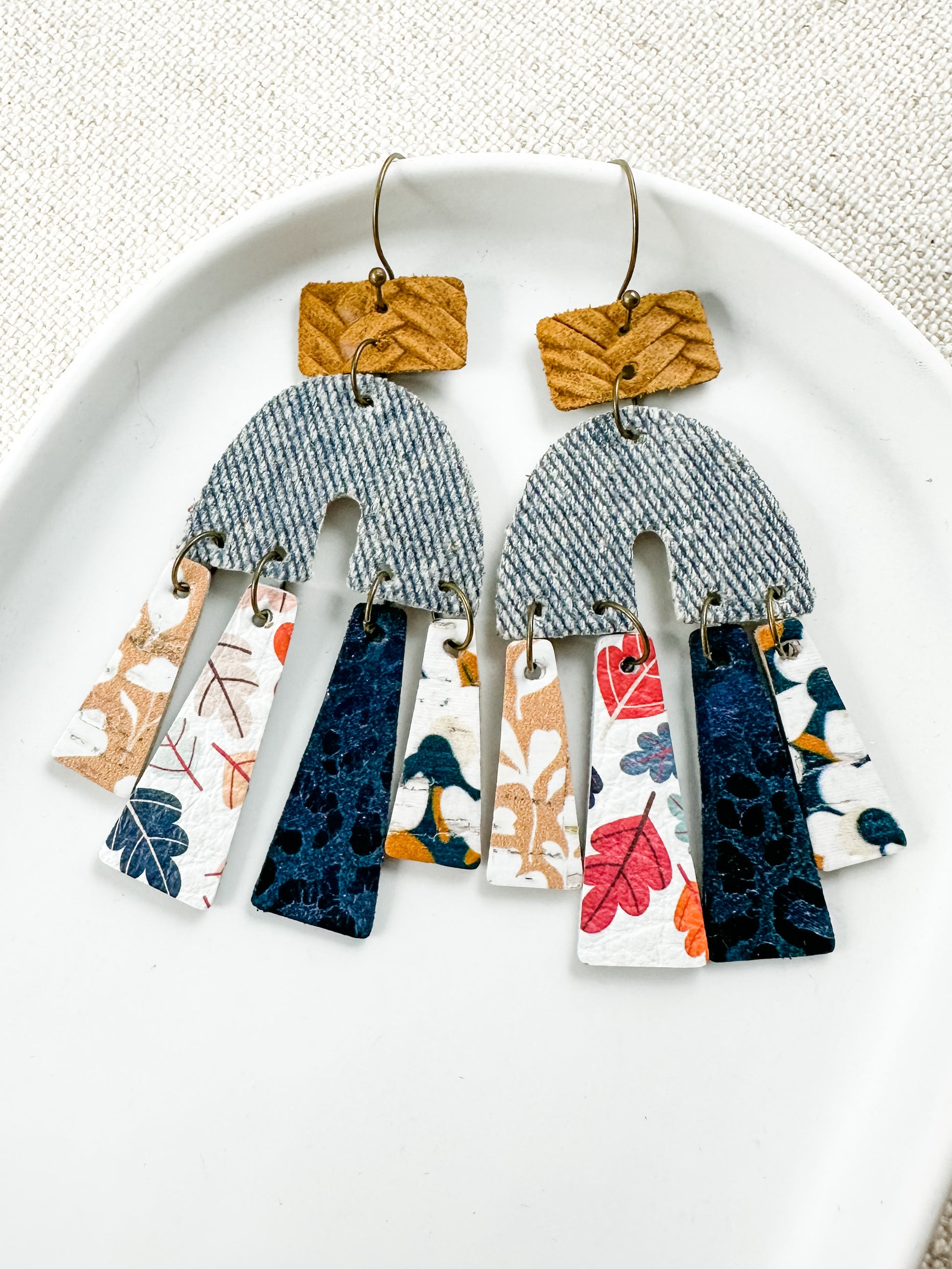 fall statement earrings, autumn arch earrings, leather and cork earrings, mixed material earrings, lightweight fall earrings, bold dangle earrings, fall foliage earrings, leaf print earrings, denim and leather earrings, boho arch earrings, colorful autumn earrings, handmade statement earrings, boutique fall earrings, nature inspired jewelry, fall fashion accessories, thanksgiving earrings, fall jewelry for women, seasonal statement earrings, rustic arch earrings, artisan earrings for fall, unique boutique earrings, gift for fall lovers, bold lightweight earrings, colorful arch earrings, whimsical fall earrings, artistic earrings under 30, handcrafted boho jewelry