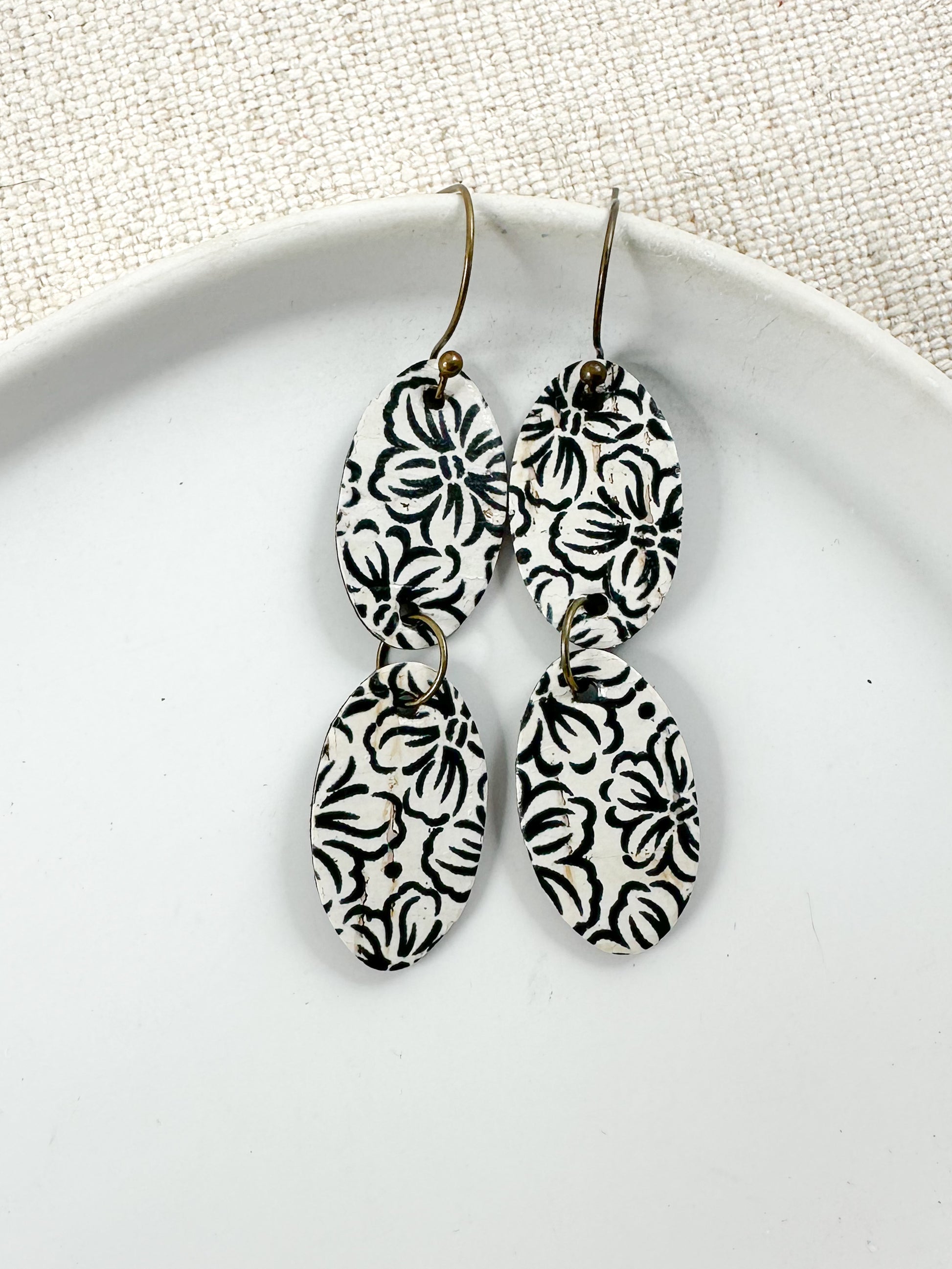 floral print dangle earrings, black and white earrings, oval drop earrings, handmade leather earrings, boho floral earrings, statement leather earrings, neutral printed earrings, everyday drop earrings, artisan earrings for women, lightweight statement earrings, double oval earrings, floral leather jewelry, casual floral earrings, unique leather earrings, gift for her under 30, flower print earrings, modern western earrings, rustic chic earrings, vintage floral earrings, boutique earrings for women, mom gift ideas, teacher gift ideas, summer earrings, fall earrings, brunch outfit accessories, artisan fashion jewelry, boutique dangle earrings, trending floral earrings, handcrafted earrings USA, printed leather earrings, boho cowgirl earrings, bold black and white earrings, floral western earrings, floral fashion jewelry, floral leather drops, layered leather earrings, whimsical statement earrings, botanical earrings, nature-inspired jewelry, Anabelle and Oak earrings