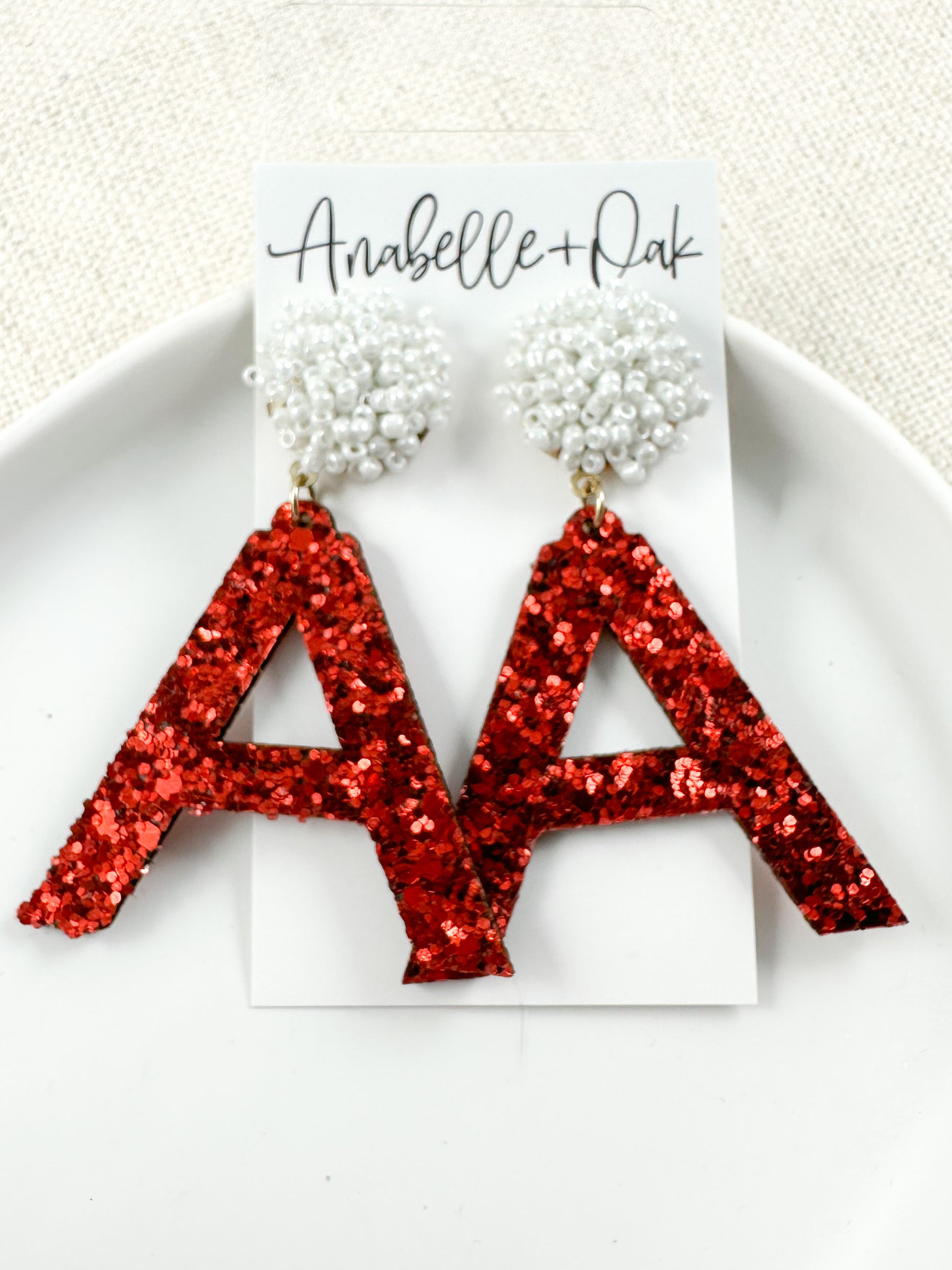 red glitter earrings, sequin letter earrings, A letter earrings, bold statement earrings, sparkly red earrings, college game day earrings, red and white earrings, beaded stud earrings, fan earrings for women, spirit wear accessories, boutique earrings for sports fans, earrings for game day outfits, southern football fan earrings, custom letter earrings, handmade sports earrings, tailgate accessories, earrings for sports moms, red sequin accessories, big bold earrings, cheer team earrings, red earrings for fans, earrings for pep rallies, sports-themed jewelry, college spirit earrings, red fashion earrings, earrings for college game day, team pride earrings, cute earrings for fans, earrings for Alabama game day, earrings for Arkansas fans