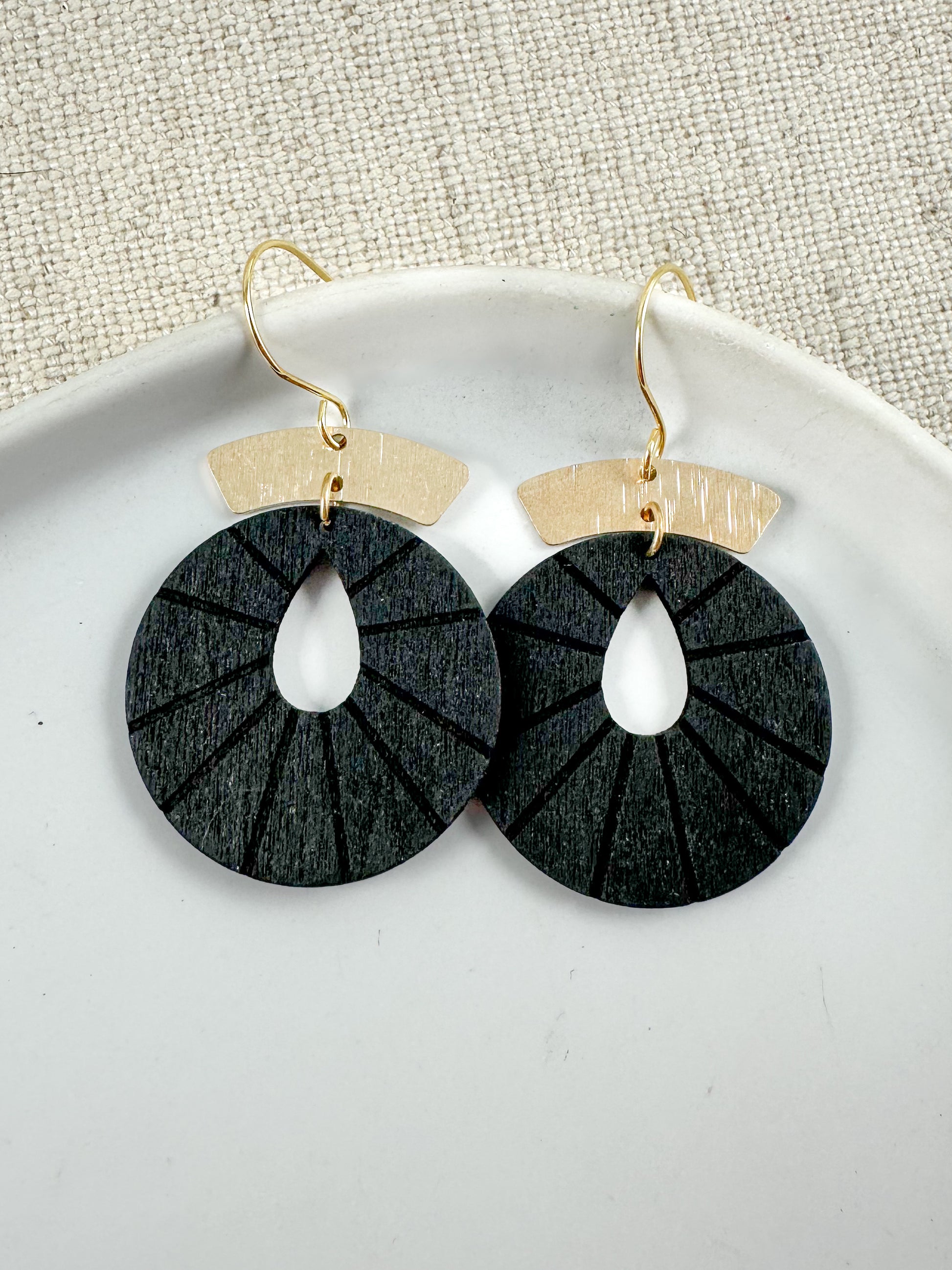 black sunburst earrings, black wood drop earrings, lightweight black earrings, tear drop cut earrings, sunburst design earrings, brushed gold accent earrings, everyday black earrings, neutral statement earrings, boho black earrings, modern wood earrings, minimal black earrings, fall black earrings, winter black earrings, holiday party earrings, gift for her earrings, stocking stuffer jewelry, casual black earrings, dressy black earrings, lightweight statement earrings, neutral wood drop earrings