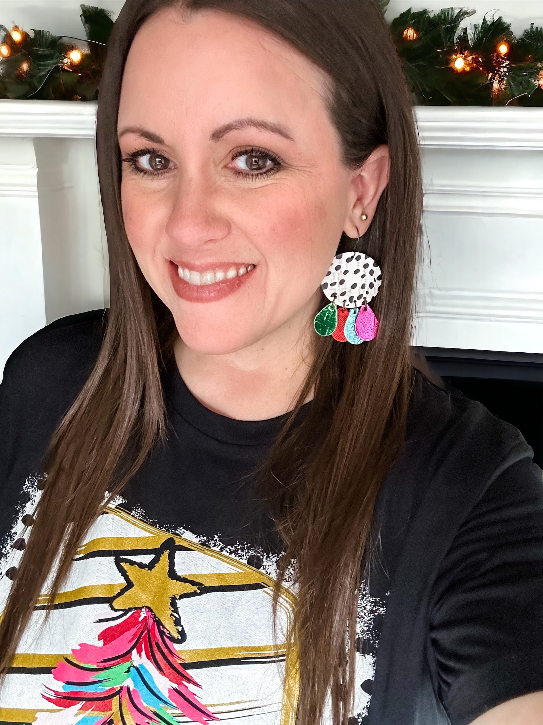 These Bright & Happy Earrings, with a 2.25" drop, are just the right mix of playful and eye-catching! Handmade with care, they feature a fun animal print base and a cascade of colorful, metallic teardrops in pink, green, red, and silver. Each piece is crafted to bring a little burst of joy to your day, without overwhelming your look.
