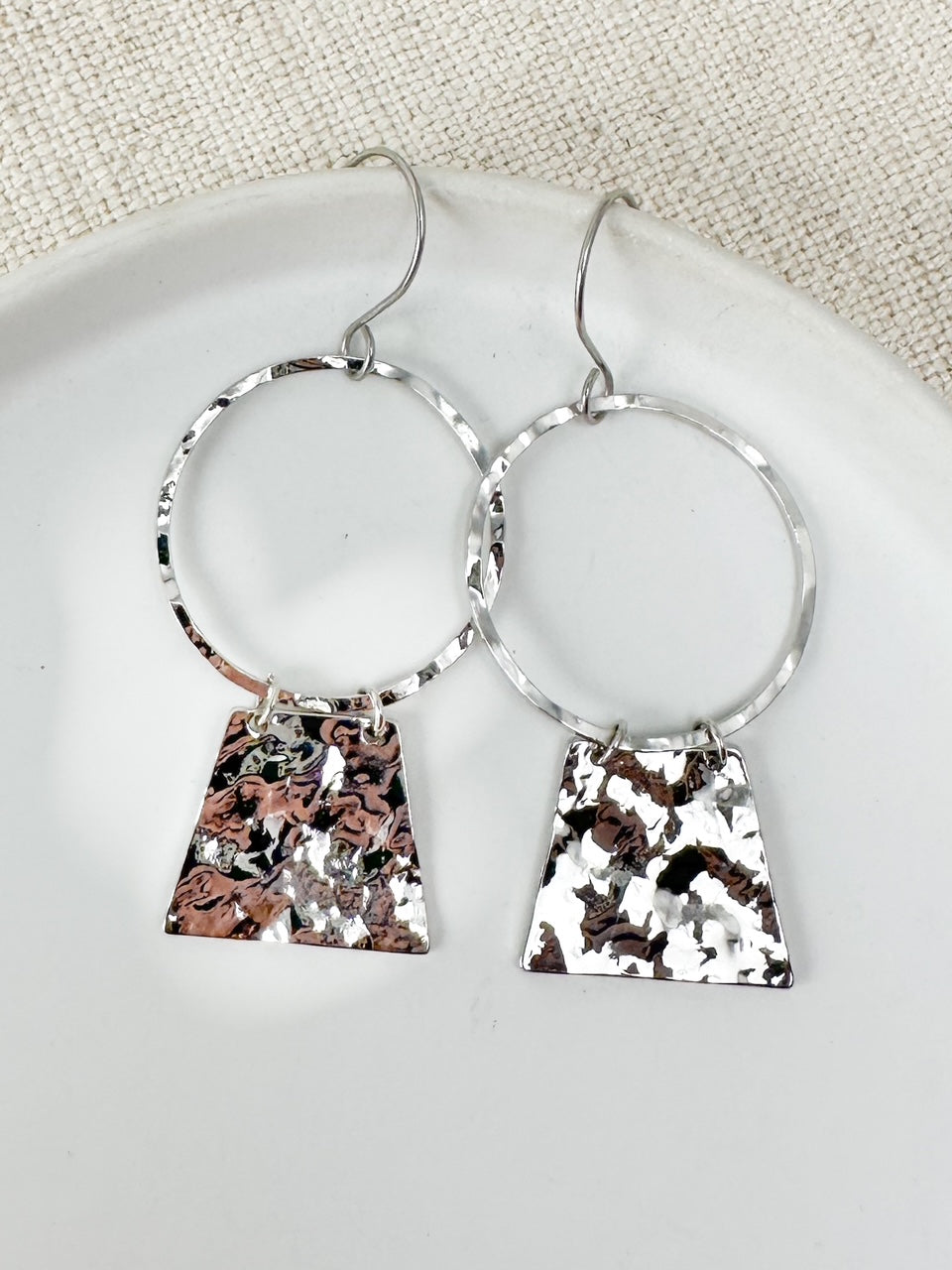 silver hammered metal earrings, silver dangle earrings, geometric silver earrings, textured metal earrings, lightweight silver earrings, artisan silver jewelry, handcrafted silver earrings, hammered silver drop earrings, modern silver earrings, minimalist statement earrings, silver trapezoid earrings, boutique style earrings, casual silver earrings, edgy silver jewelry, boho silver earrings, sculptural earrings for women, artsy silver dangles, silver earrings under $50, gift for her silver jewelry, silver earrings for everyday wear, stylish silver earrings, contemporary silver earrings, oxidized silver earrings, unique silver earrings, silver hoop and drop earrings, artisan earrings for women, trendy boutique earrings, giftable silver jewelry, modern minimalist earrings