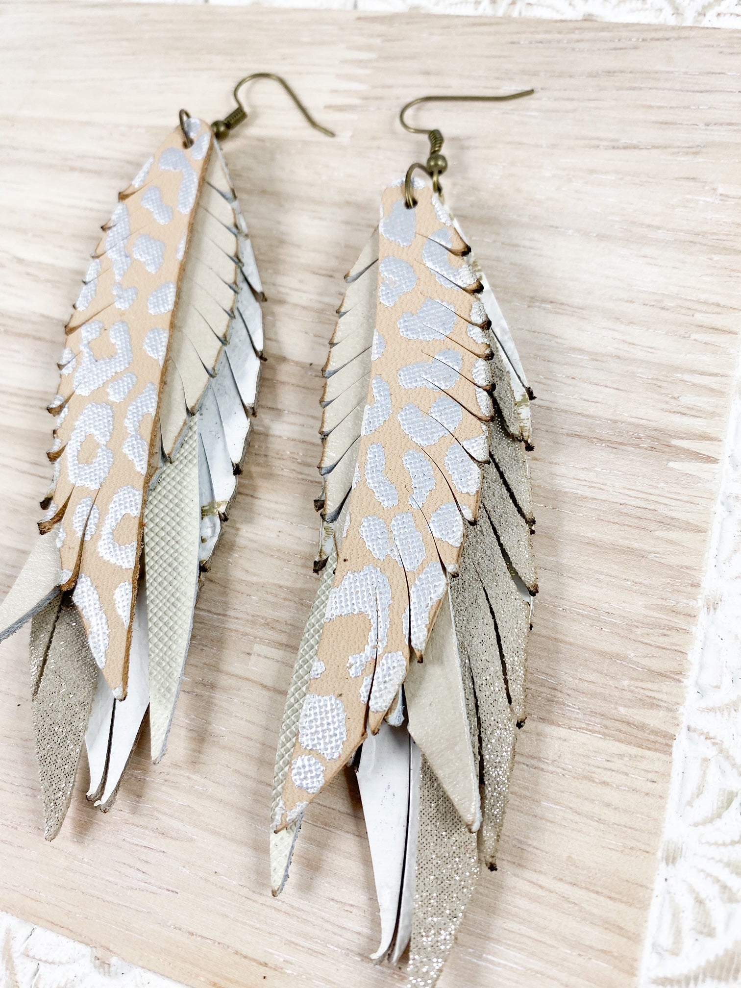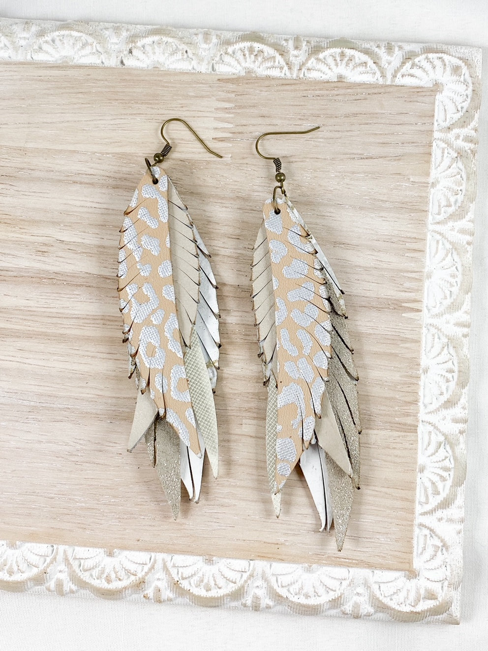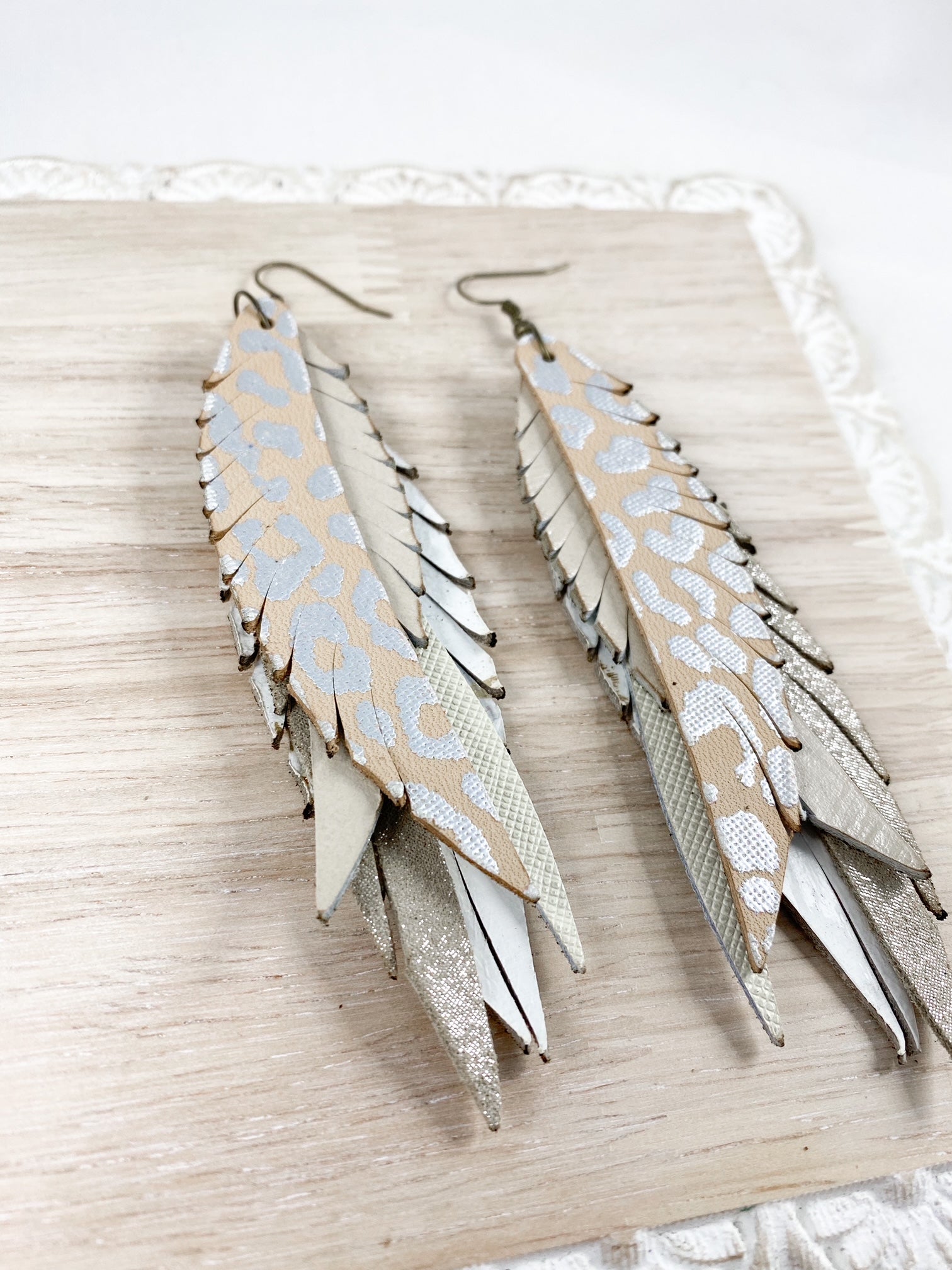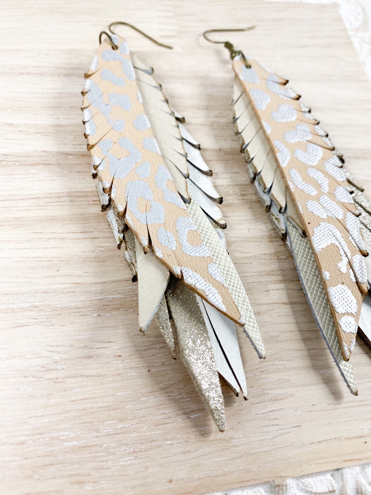 These boho fringe earrings are GORGEOUS! Five luxurious layers of champagne and ivory distressed white fringe--they are full of texture and body. These are neutral statement earrings that you can wear everyday. They will dress up or dress down equally well.