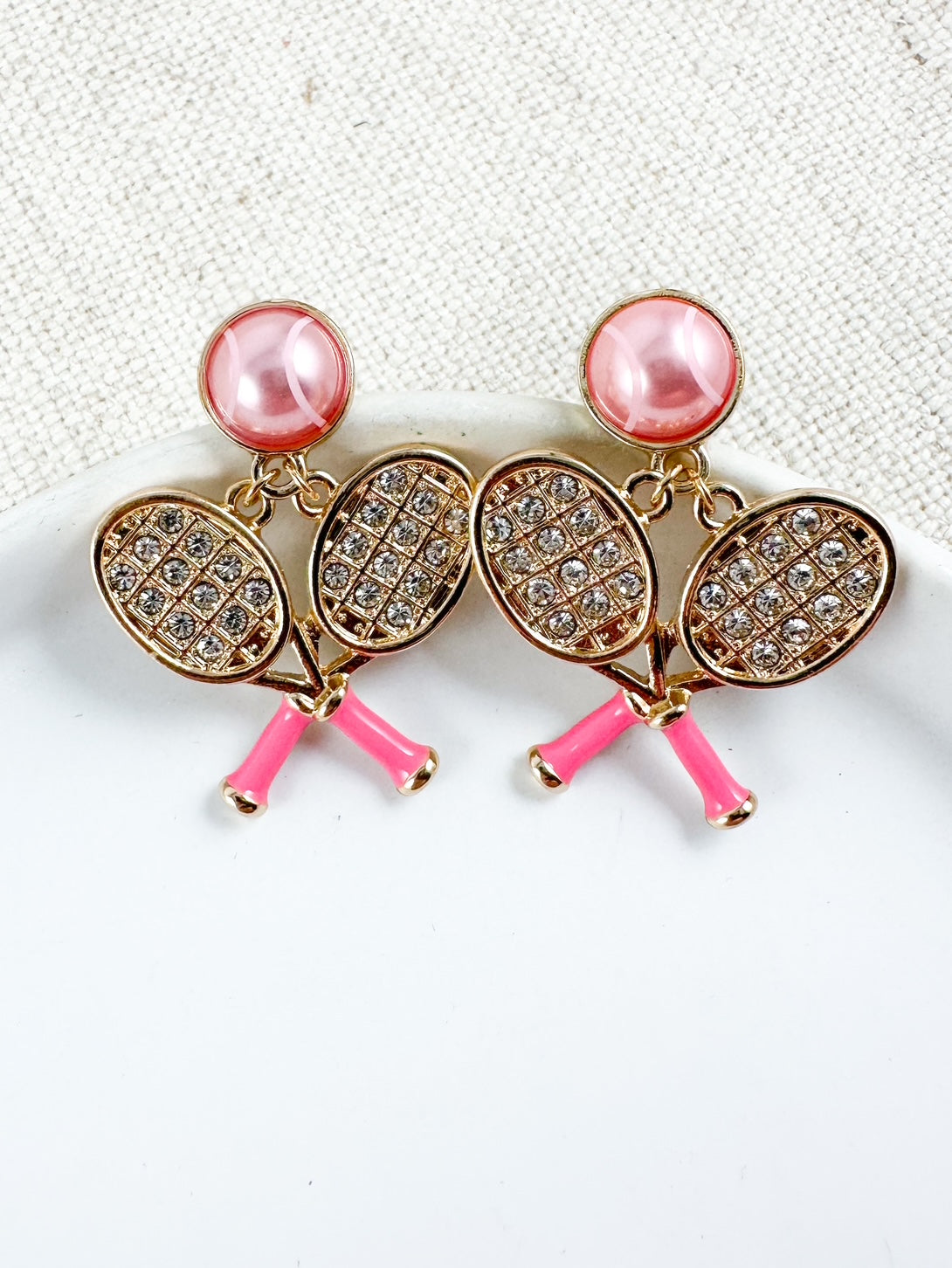 tennis earrings, racket earrings, boutique sports earrings, tennis accessories for women, sparkly tennis earrings, white and yellow earrings, fashion earrings for tennis fans, earrings for tennis players, rhinestone tennis earrings, tennis gift for her, playful statement earrings, trendy sports earrings, boutique tennis jewelry, tennis team gift, tennis match accessories, earrings under $30, cute tennis earrings, fun racket earrings, tennis drop earrings, lightweight sport earrings, glam game day jewelry, summer sports earrings, fashion earrings for athletes, tennis themed earrings, pearl top earrings, statement earrings with sparkle, white handle racket earrings, girly tennis earrings, country club style jewelry