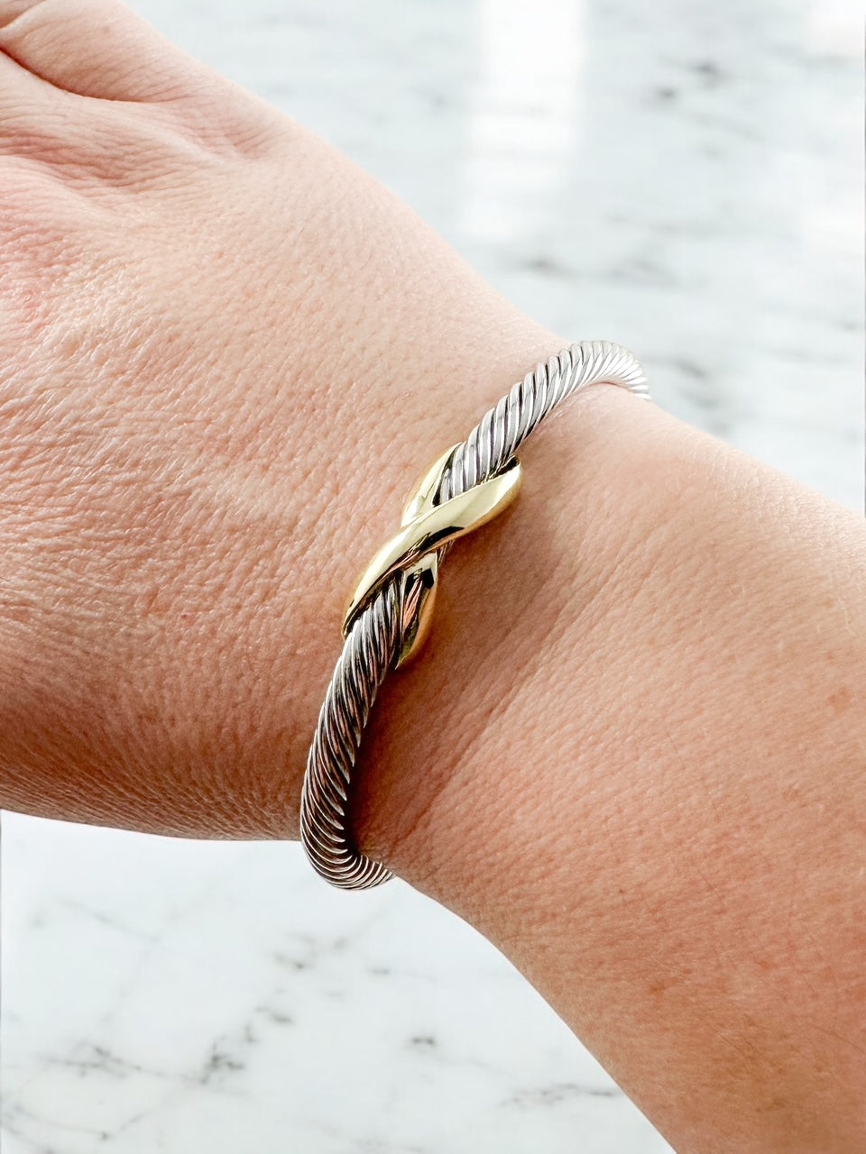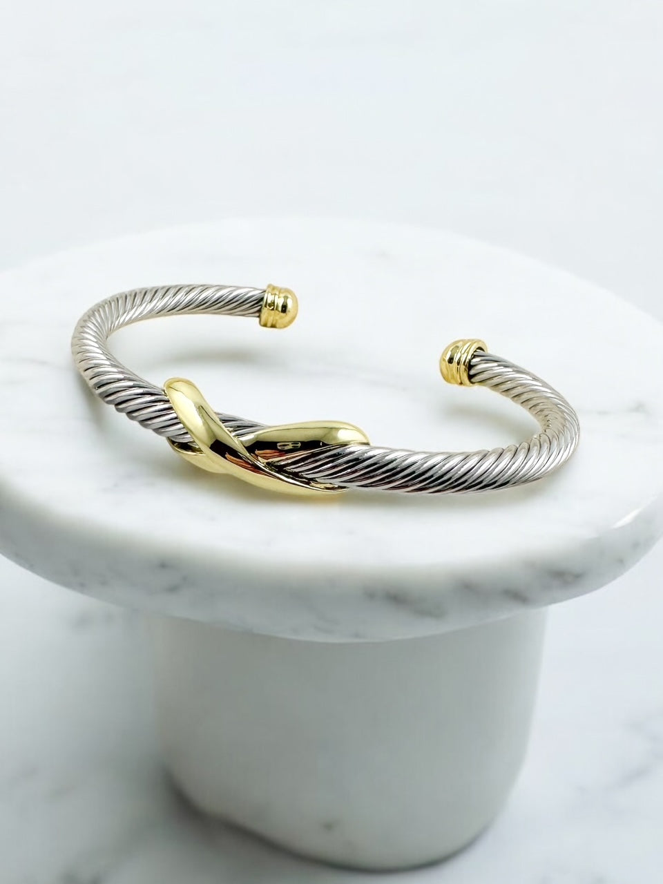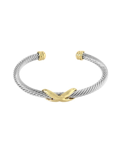 mixed metal cuff bracelet, silver and gold cuff bracelet, cable cuff bracelet, twisted cable bracelet, gold x cuff bracelet, everyday cuff bracelet, silver cuff bracelet women, gold accent cuff bracelet, trendy mixed metal jewelry, sleek modern cuff bracelet, stacking cuff bracelet, open cuff bracelet women, adjustable cuff bracelet, luxury inspired cuff bracelet, polished silver cuff with gold accents, bracelet for workwear, bracelet for night out, gift for her bracelet, minimalist cuff bracelet, classic silver and gold bracelet, fashionable cuff bracelet, jewelry gift for mom, jewelry gift for wife, bridesmaid bracelet gift, birthday jewelry gift, holiday bracelet gift, womens cuff bracelet stackable, trending cuff bracelet womens
