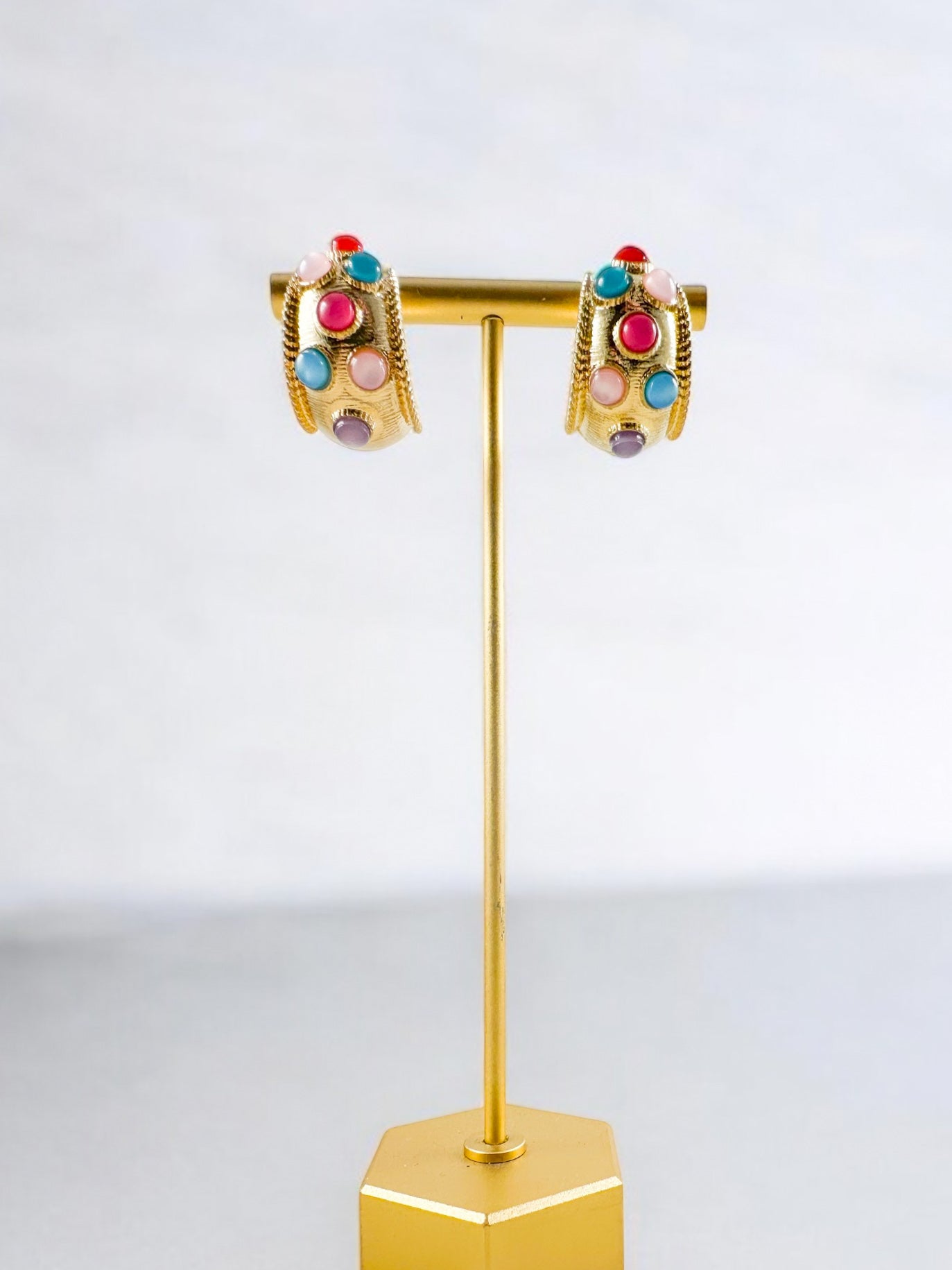 gold jewel hoop earrings, colorful gemstone hoops, multicolor studded earrings, 1 inch hoop earrings, bold gold earrings, trendy statement hoops, crown-inspired earrings, royal look earrings, jewel tone accessories, high-end costume jewelry, boutique gold hoops, polished glam earrings, rainbow jewel earrings, small chunky hoops, colorful huggie earrings, luxe fashion jewelry, unique gold earrings, playful gemstone hoops, everyday glam earrings, summer jewelry trends, concert outfit earrings, vacation-ready hoops, girls night accessories, birthday gift for her, jewelry for teens and moms, bridesmaid earring idea, holiday party earrings, trending boutique earrings, giftable under $25, multicolor fashion earrings, statement accessory for summer, color pop earrings, gold hoops with gems, bold but wearable jewelry