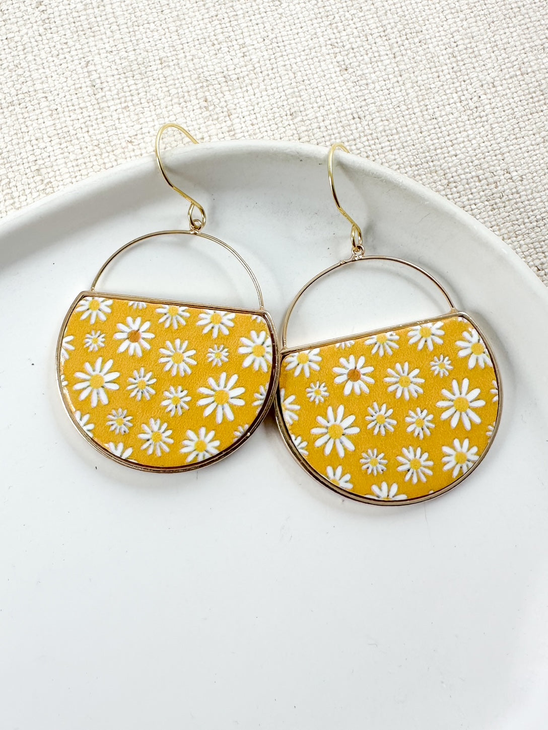 mustard floral earrings, mustard daisy earrings, leather daisy earrings, fall flower earrings, boho daisy earrings, lightweight leather earrings, half hoop earrings, fall statement earrings, transitional earrings for fall, mustard leather earrings, daisy print earrings, floral half circle earrings, trendy leather earrings, autumn floral accessories, artisan-inspired earrings, flower pattern earrings, fall boho jewelry, casual everyday earrings, gift for her floral earrings, retro floral earrings, earrings for sensitive ears
