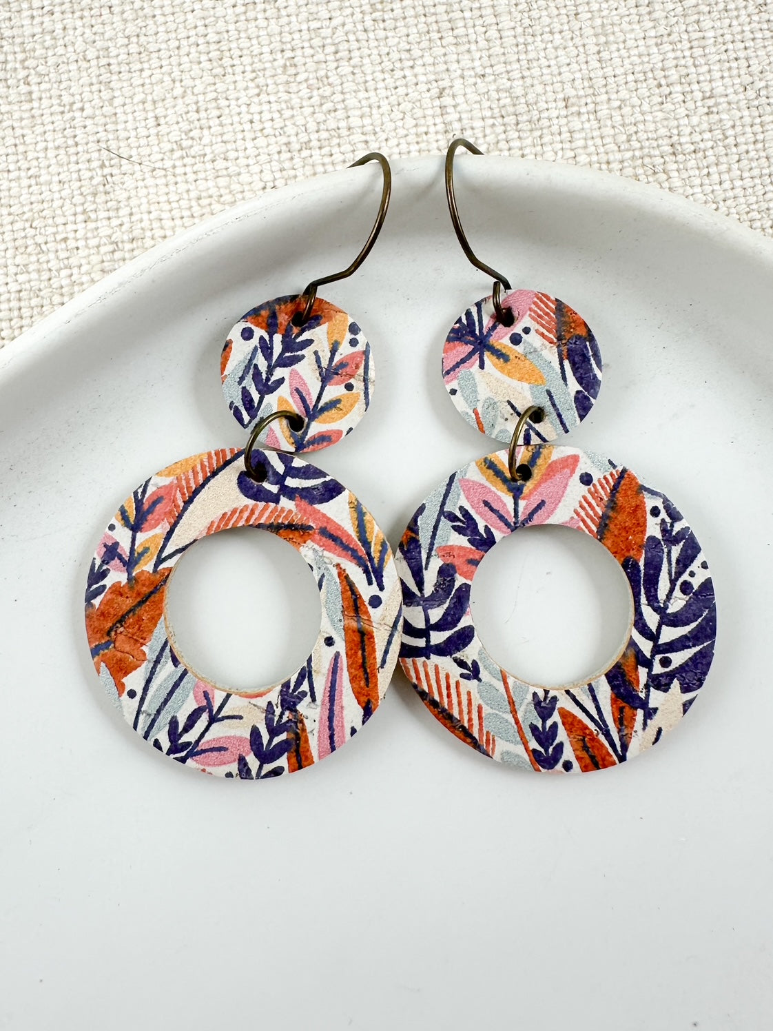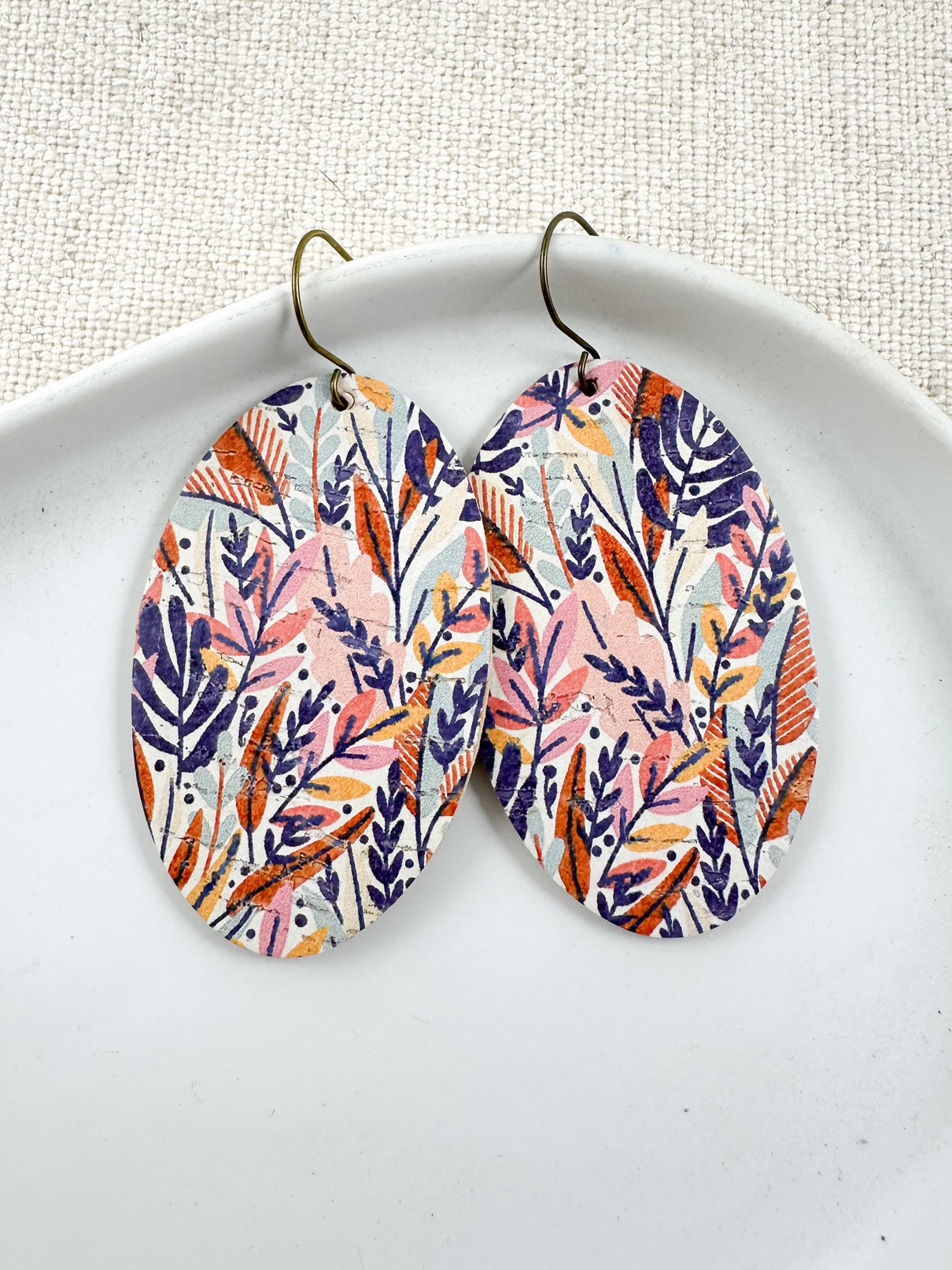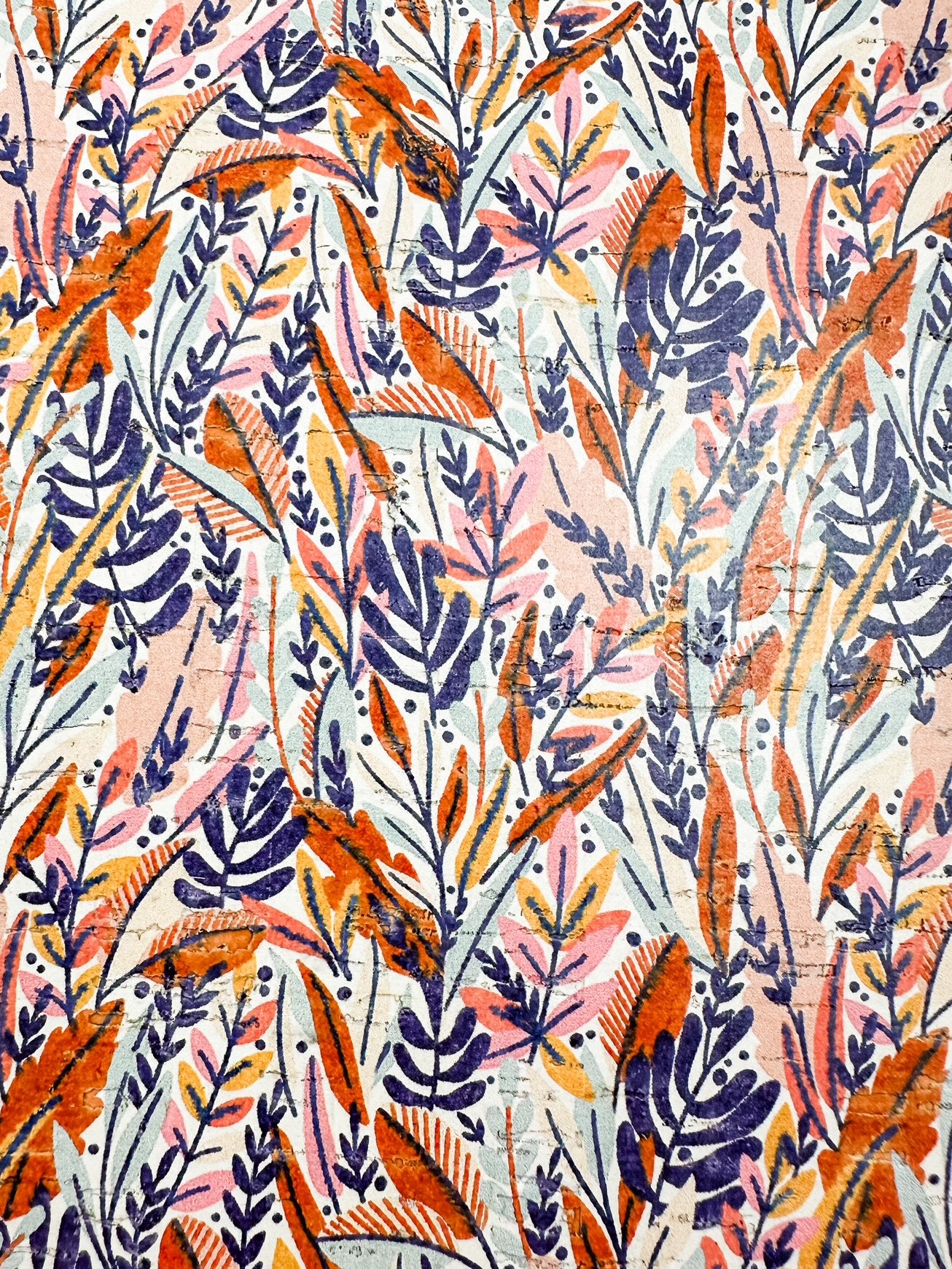 This lightweight cork is backed with genuine leather and features a beautiful blend of burnt orange, golden marigold, plum, blush, and sage—all dancing across a soft natural base in a layered floral and leafy design. It feels like stepping into a quiet meadow at golden hour—whimsical, grounded, and full of personality.
