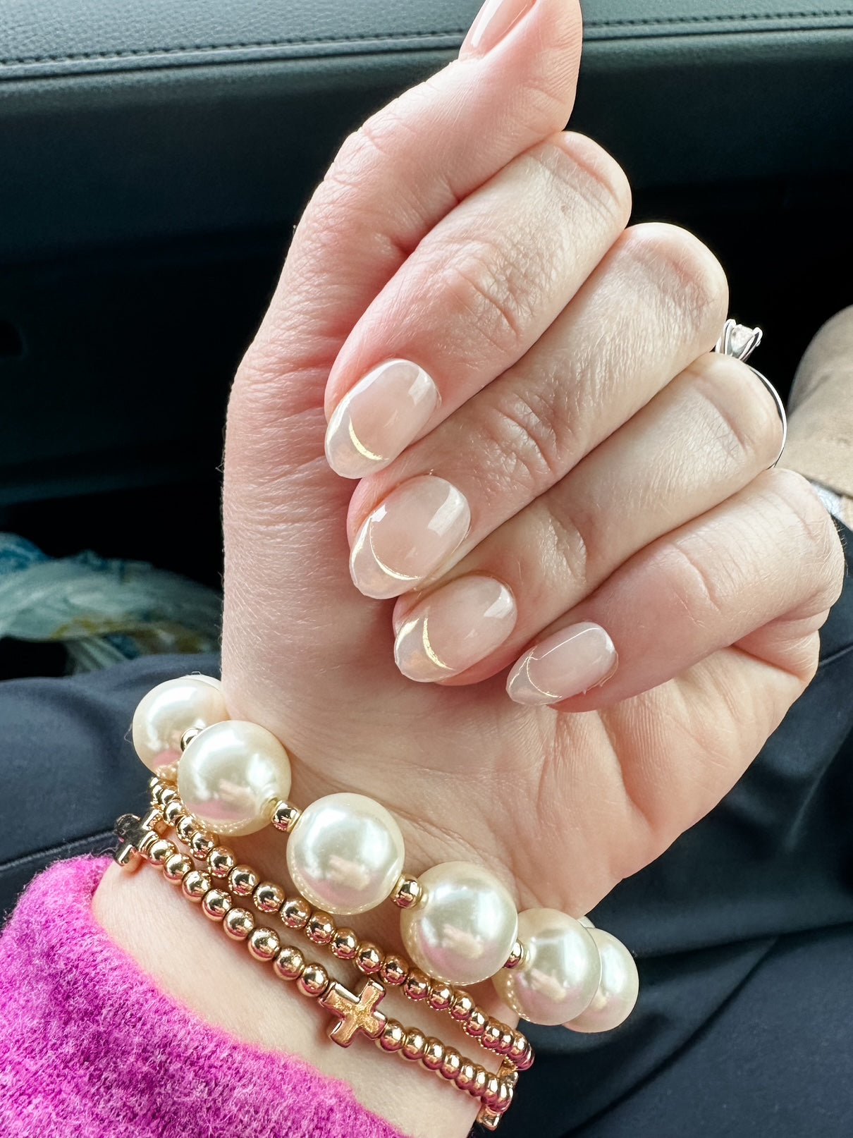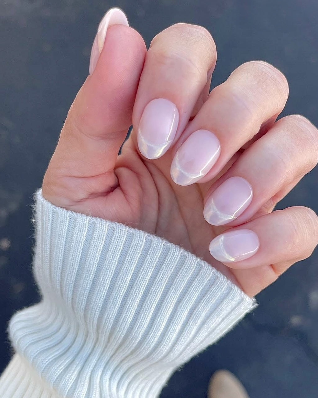 Color: Blush pink with iridescent, textured French manicure tips