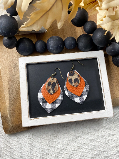 They are made from genuine leather. The top layer is a fabulous leopard print pattern, followed by a gorgeous burnt orange, all on top of a trendy black and white buffalo plaid. Ear hooks are nickel-free and lead-free.