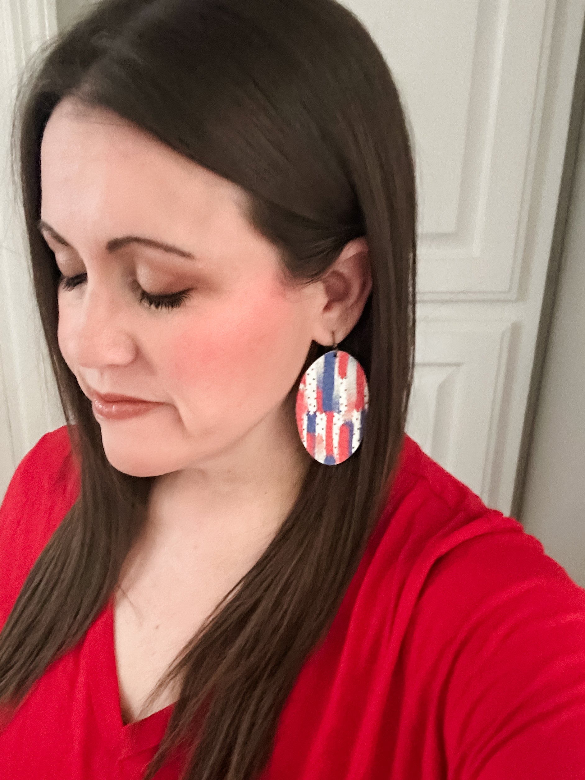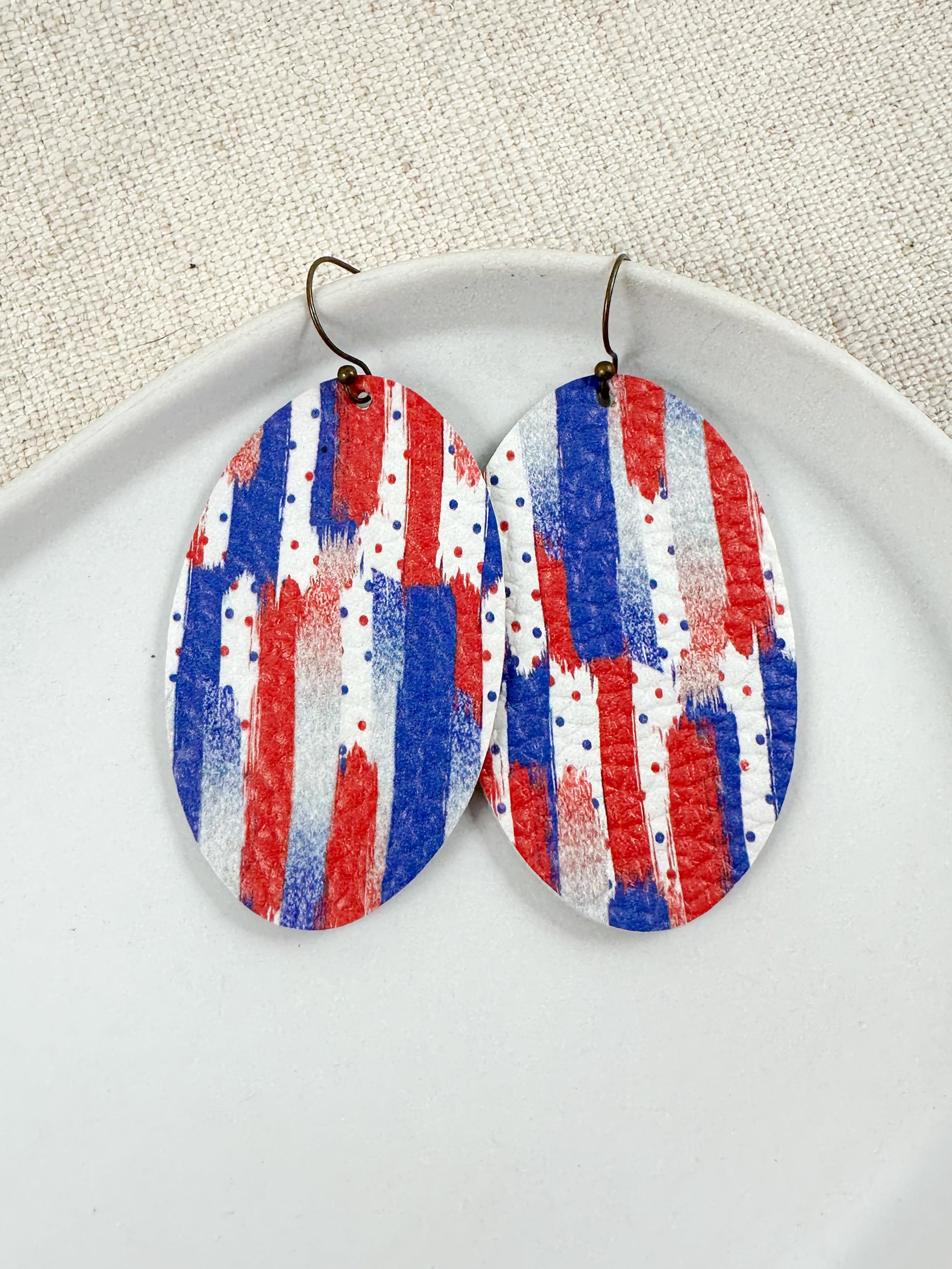 red white blue leather earrings, patriotic leather statement earrings, brushstroke print leather earrings, confetti print leather drop earrings, 2.5 inch leather statement earrings, large dogwood shape leather earrings, genuine leather patriotic earrings, lightweight summer leather earrings, handmade patriotic leather jewelry, USA flag inspired leather earrings, festive red white blue earrings, Fourth of July leather earrings, Memorial Day leather earrings, artisan leather dangle earrings, boho patriotic earrings, colorful leather drop earrings, American flag color earrings, bold patriotic leather earrings, unique leather earrings for women, trending patriotic earrings