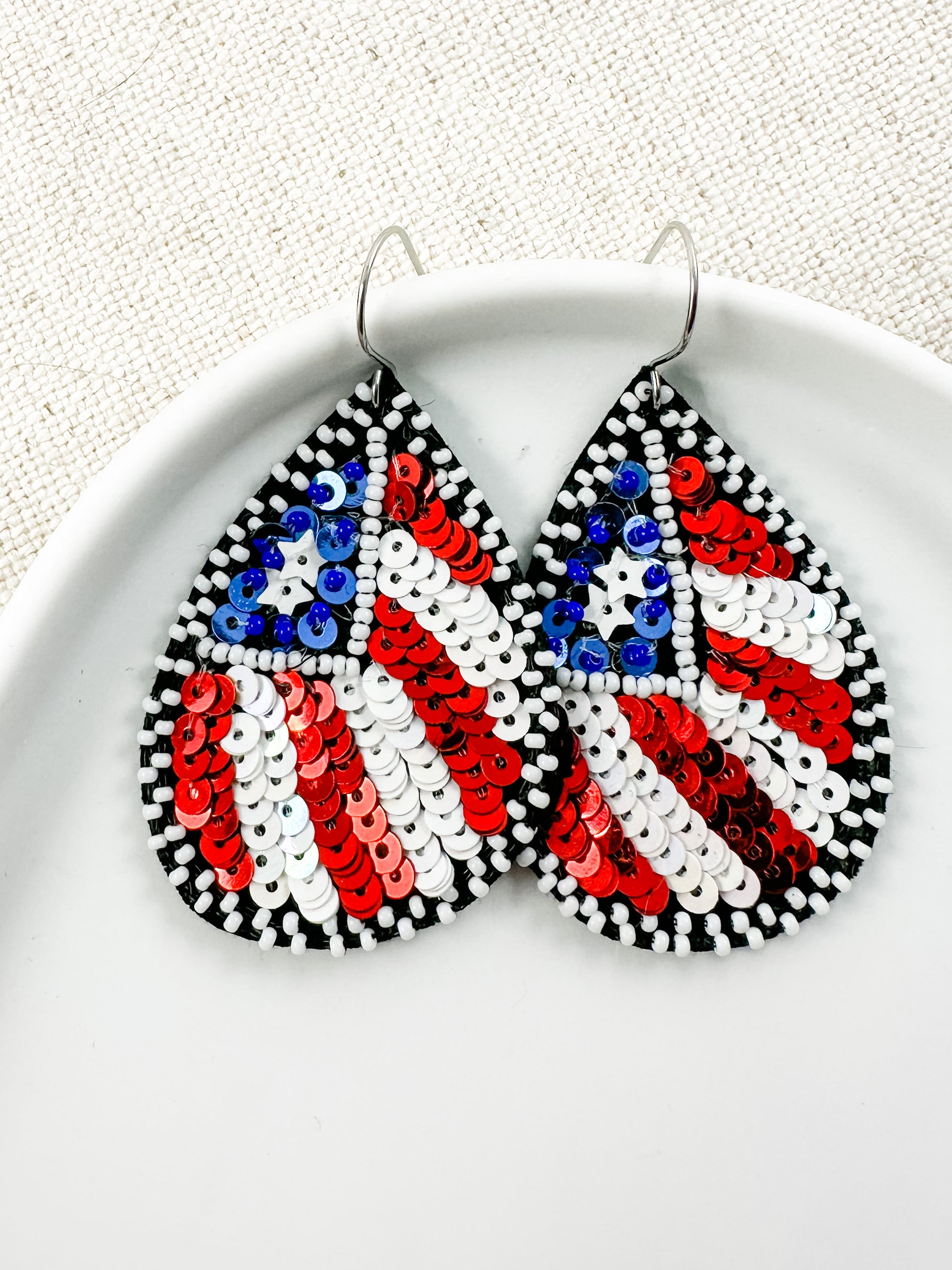 patriotic earrings, USA flag earrings, American flag earrings, red white and blue earrings, Fourth of July earrings, sequin earrings, teardrop earrings, statement patriotic earrings, stars and stripes earrings, glitter flag earrings, patriotic dangle earrings, bold statement earrings, lightweight statement earrings, festive patriotic jewelry, Independence Day accessories, Memorial Day earrings, Labor Day fashion, Americana earrings, Western style jewelry, rodeo fashion accessories, summer statement earrings, trendy patriotic earrings, stylish Fourth of July accessories, country concert earrings, firework show earrings, sparkly patriotic earrings, dazzling sequin earrings, holiday party jewelry, American spirit earrings, festival fashion earrings, star-spangled accessories, fun and festive earrings, bold patriotic fashion, party-ready statement earrings, elegant patriotic earrings, statement Americana jewelry, patriotic fringe earrings, grand celebration earrings, trendy summer accessories, stylish gift for her, patriotic gift for women, unique summer jewelry, eye-catching holiday earrings
