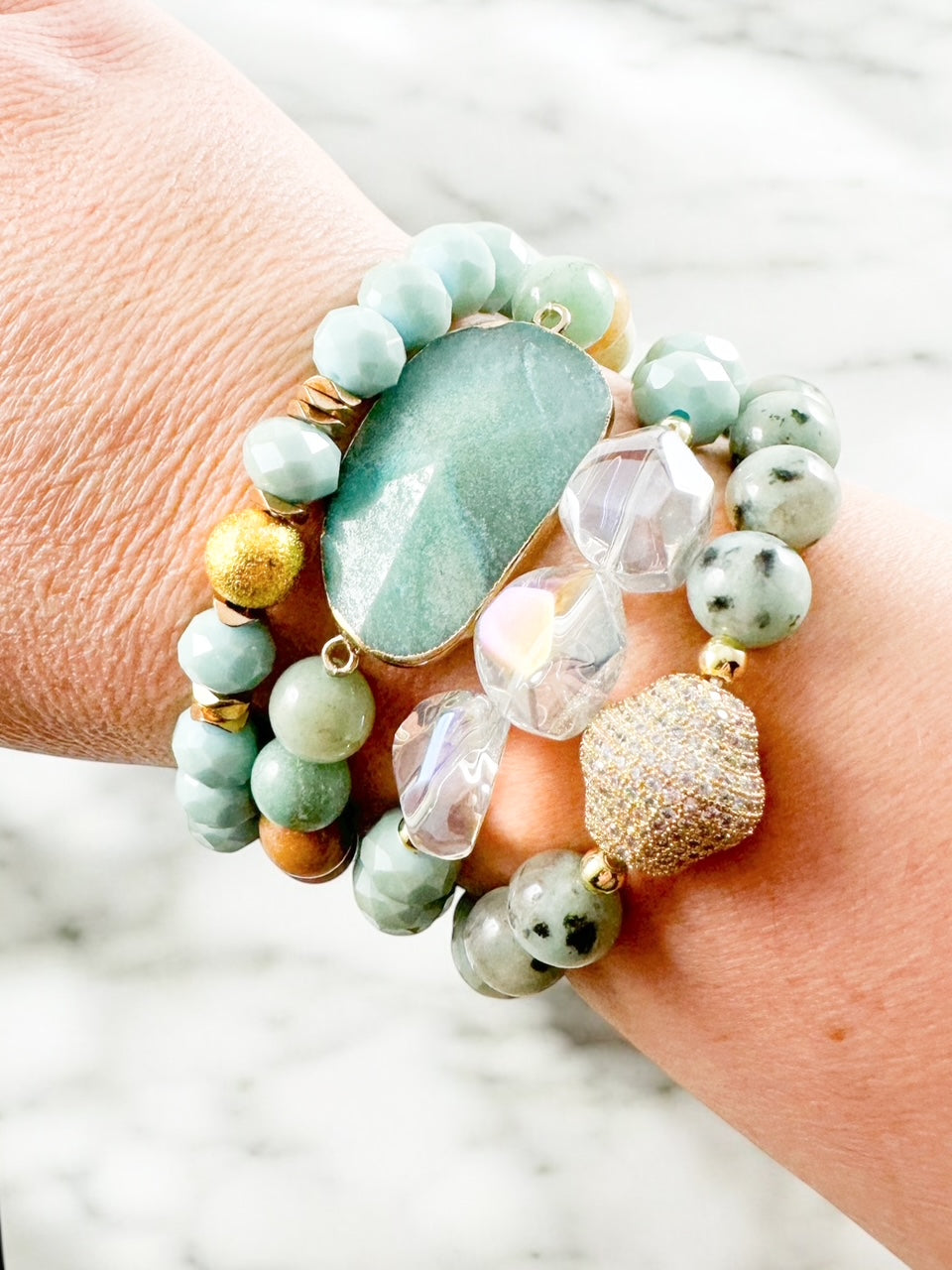 amazonite bracelet set, seafoam green bracelet, mint green stretch bracelets, aqua beaded bracelets, frosted crystal bracelet set, natural stone bracelet stack, handmade amazonite jewelry, pastel green bracelet, layered bracelet set, coastal style bracelet, beachy boho bracelets, 4 piece bracelet stack, boutique stretch bracelets, green crystal bracelets, amazonite stacking bracelets, neutral green jewelry, light green beaded bracelet, summer bracelet set, beach vacation jewelry, spring accessory for women, boho chic bracelet set, gift for her under 40, everyday gemstone bracelet, trendy mint bracelet stack, amazonite jewelry for women, Anabelle+Oak bracelet set, sea glass inspired bracelet