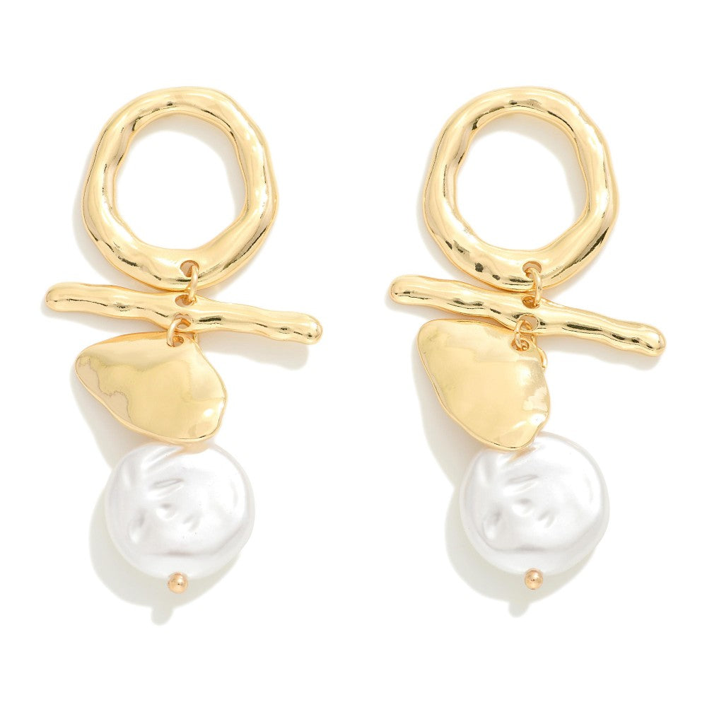 gold and pearl drop earrings, abstract gold earrings, statement gold earrings, modern pearl earrings, dangle earrings with pearls, gold sculptural earrings, unique gold earrings, holiday party earrings, wedding guest jewelry, vacation outfit accessories, dressy gold earrings, lightweight statement earrings, artistic jewelry for women, elegant gold dangles, coastal style earrings, resort fashion jewelry, trendy pearl jewelry, high-end gold earrings, gift for fashion lover, spring statement earrings, fall wedding earrings, art-inspired earrings, hammered gold earrings, mother of pearl inspired earrings, cocktail outfit earrings