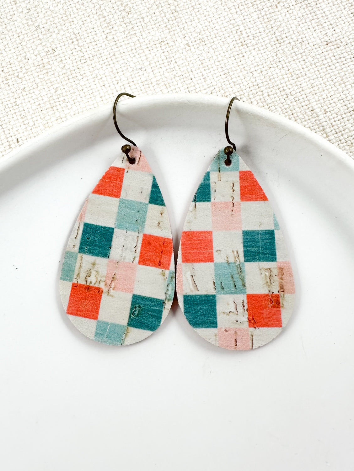 coral and teal plaid earrings, gingham leather earrings, cork teardrop earrings, lightweight summer earrings, handmade plaid earrings, colorful cork earrings for women, pastel check earrings, pink and teal statement earrings, casual spring earrings, boho gingham earrings, farmhouse style earrings, gift for teachers, everyday plaid earrings, beach picnic earrings, summer fashion earrings, rustic cork earrings, playful checkered earrings, lightweight earrings for sensitive ears, southern style earrings, bold teardrop earrings, colorful gingham earrings, coral teal and pink earrings, weekend outfit accessories, fun earrings for summer