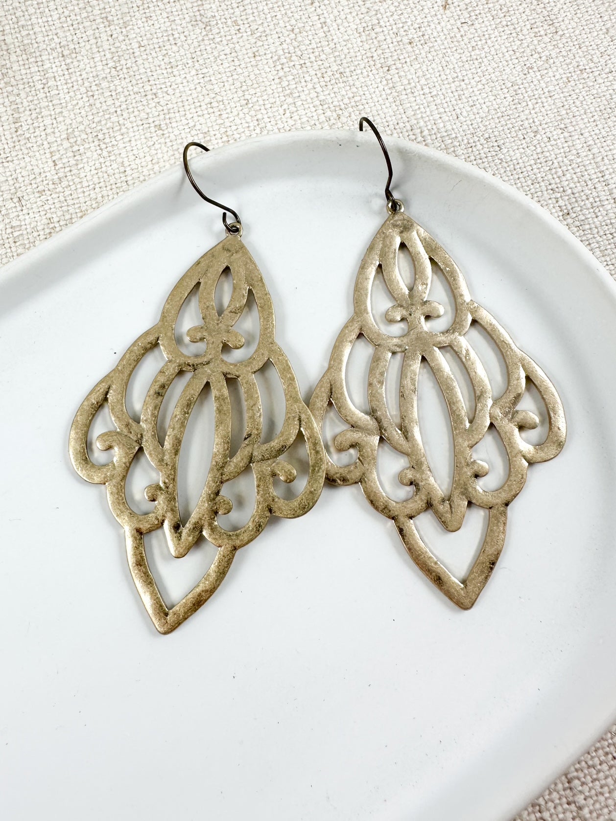 gold filigree earrings, lightweight statement earrings, cutout gold earrings, boho gold earrings, vintage inspired earrings, everyday gold earrings, gold dangle earrings, golden tapestry earrings, elegant gold earrings, boutique earrings under 25, Moroccan style earrings, antique gold earrings, ornate drop earrings, neutral gold earrings, bohemian statement earrings, artisan style jewelry, gift for her under 25, wedding guest earrings, summer gold earrings, fall fashion earrings, casual glam earrings, handmade look earrings, bold gold accessories, feminine gold jewelry, stylish boutique earrings