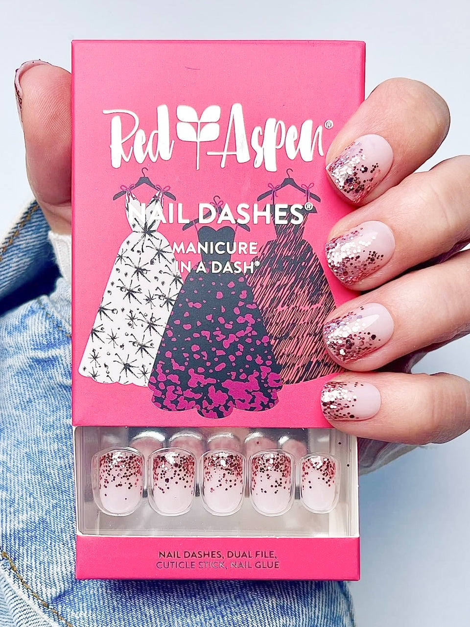 Red Aspen Nails are a customizable, press on manicure that can be applied in minutes at a fraction of the salon cost. Red Aspen Dashes come in a variety of nail shapes and lengths and can be worn for up to 2 weeks or switched out every few days. Press on, reshape and mix up your mani in minutes with Red Aspen press on nails. Get a Manicure in a Dash with the best press on nails around!