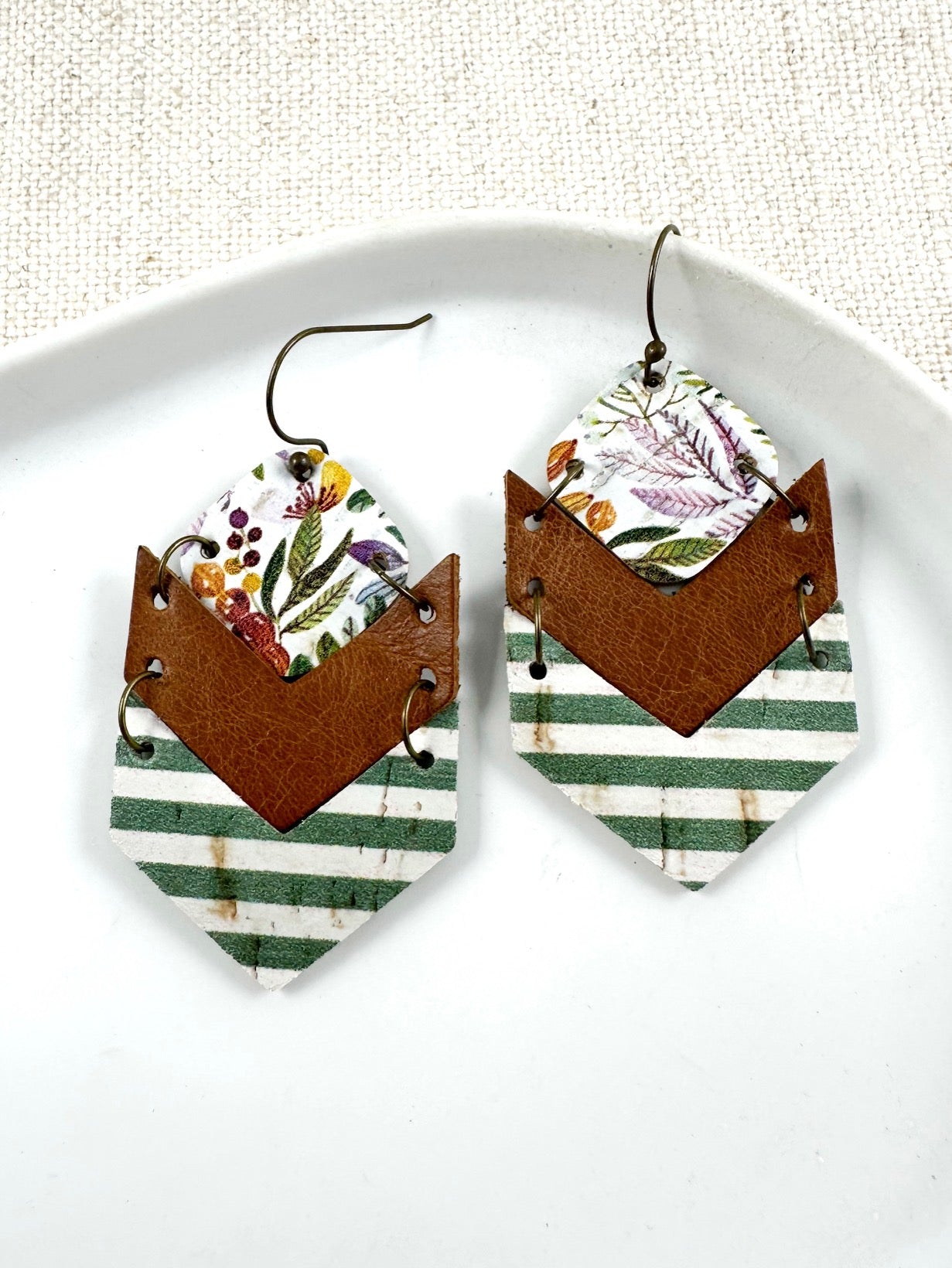 green stripe leather earrings, floral leather dangle earrings, layered leather statement earrings, genuine leather drop earrings, botanical print earrings, striped and floral earrings, lightweight leather earrings, boho garden earrings, earthy leather statement earrings, spring floral drop earrings, handmade leather earrings, casual everyday earrings, gift for her leather jewelry, artisan style leather earrings, mixed pattern leather earrings, stripe and flower earrings, versatile leather dangle, nature inspired earrings, rustic floral earrings, unique leather earrings for women
