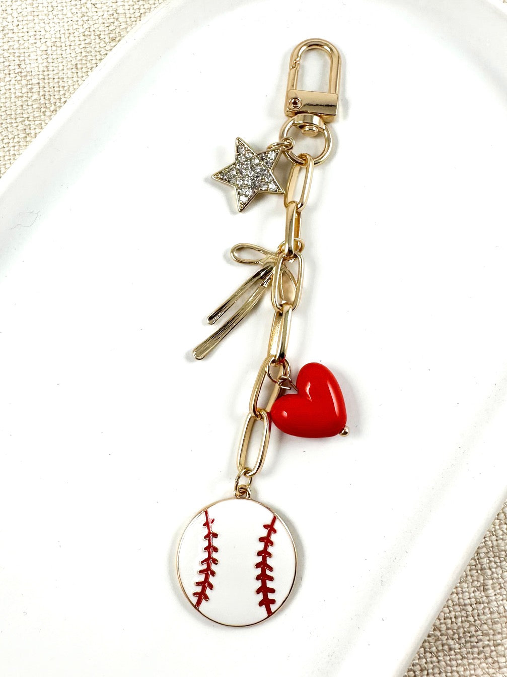 baseball bag charm, heart baseball keychain, sporty bag accessory, heart on the field charm, baseball mom gift, game day bag charm, team spirit accessories, baseball purse charm, cute baseball keychain, baseball backpack charm, red heart baseball charm, rhinestone star charm, sports bag accessories, baseball themed gift, boutique bag charm, gift for baseball fan, charm for sports mom, trendy keychain for women, baseball player gift idea, game day keychain, gold chain bag charm, sporty glam accessory, baseball season accessories, baseball charm for tote bag, baseball keyring charm