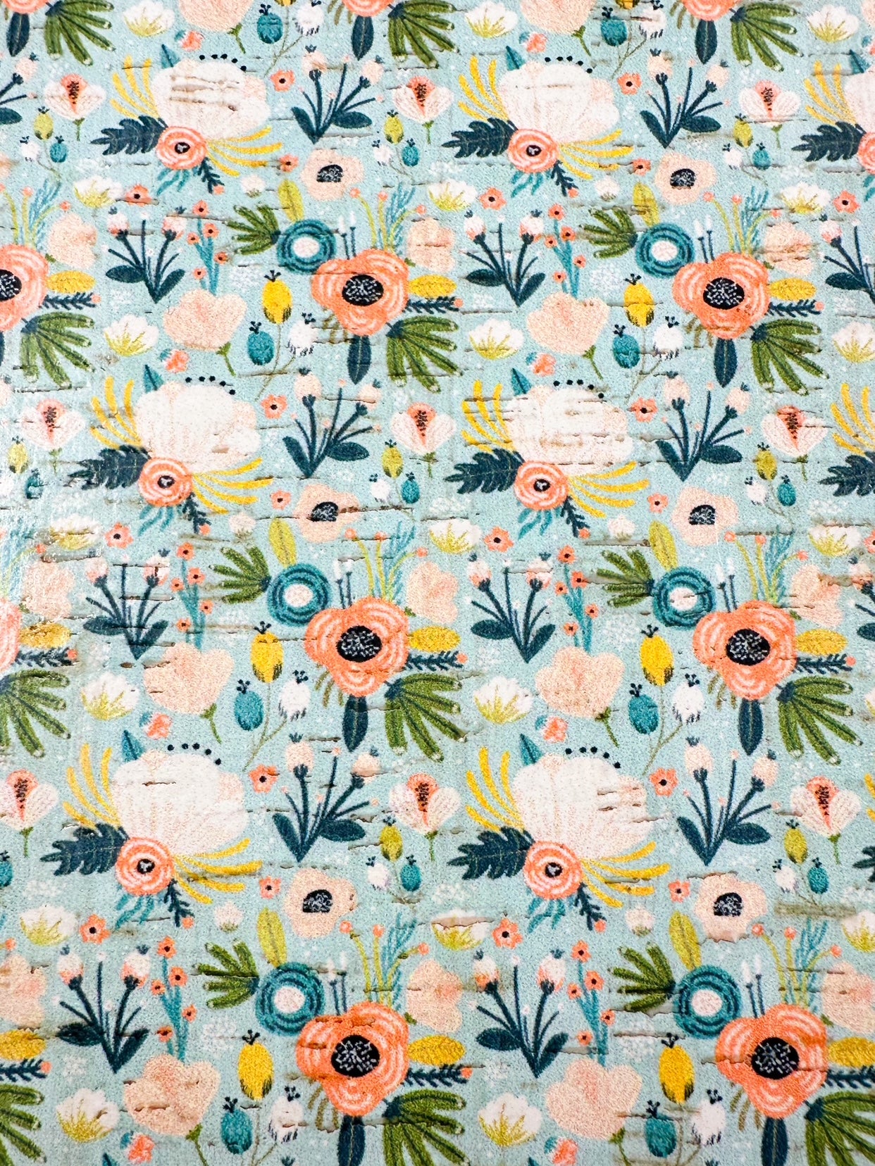 This lightweight cork is backed with genuine leather and bursting with playful blooms in coral, cream, teal, and golden yellow—all scattered across a soft aqua background. It’s got that breezy, vacation-in-a-garden feel that works just as well with denim as it does with sundresses. Basically, instant mood boost.