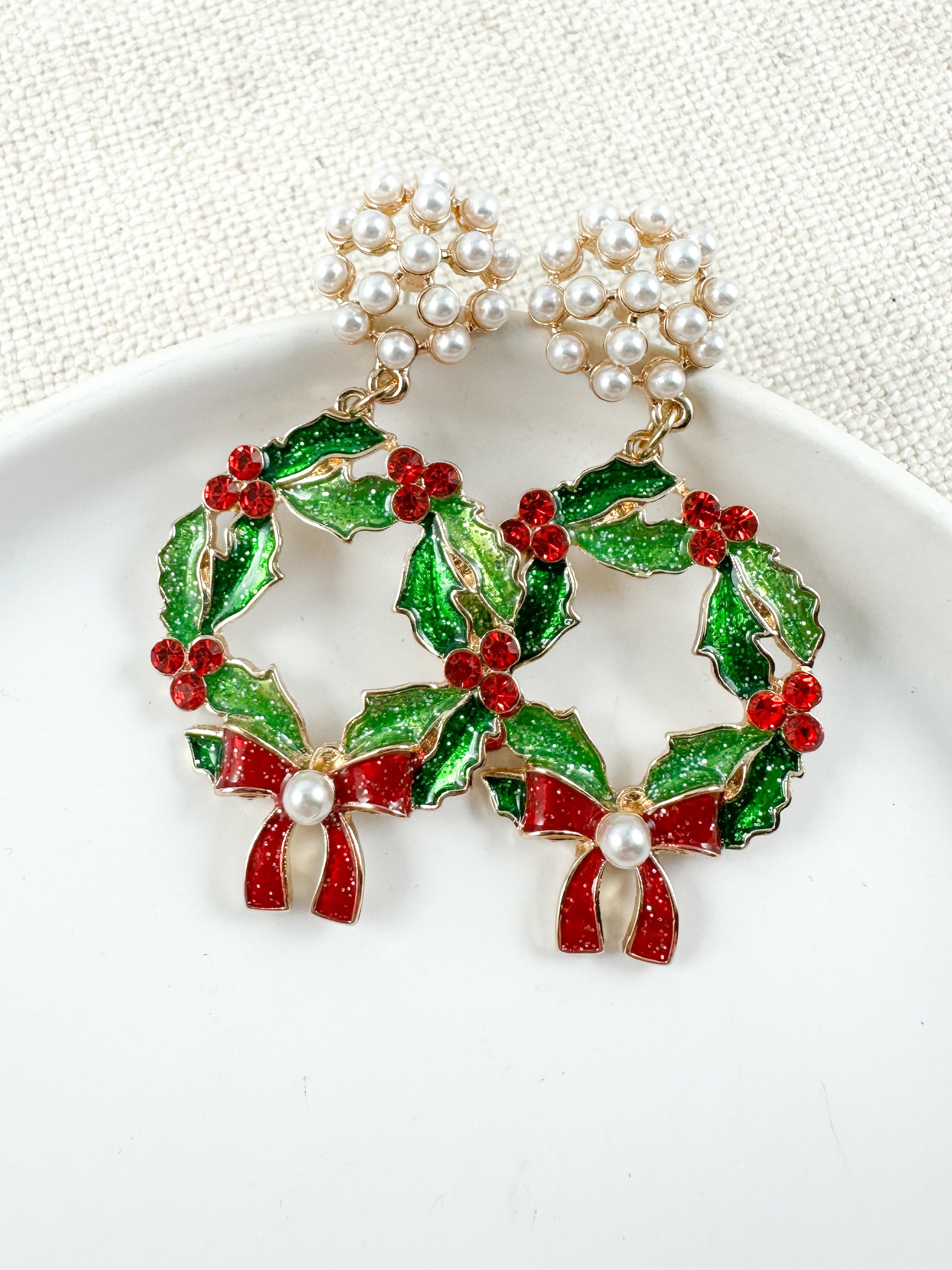 holly earrings, pearl wreath earrings, Christmas holly earrings, holiday pearl drop earrings, festive holly berry earrings, red and green Christmas earrings, statement Christmas earrings, pearl Christmas jewelry, holiday party earrings, Christmas wreath earrings, enamel holly earrings, gift for Christmas lover, winter holiday earrings, December jewelry, pearl stud holiday earrings, Christmas bow earrings, Christmas themed jewelry, vintage inspired holiday earrings, classic Christmas earrings, earrings for Christmas party, Christmas church earrings