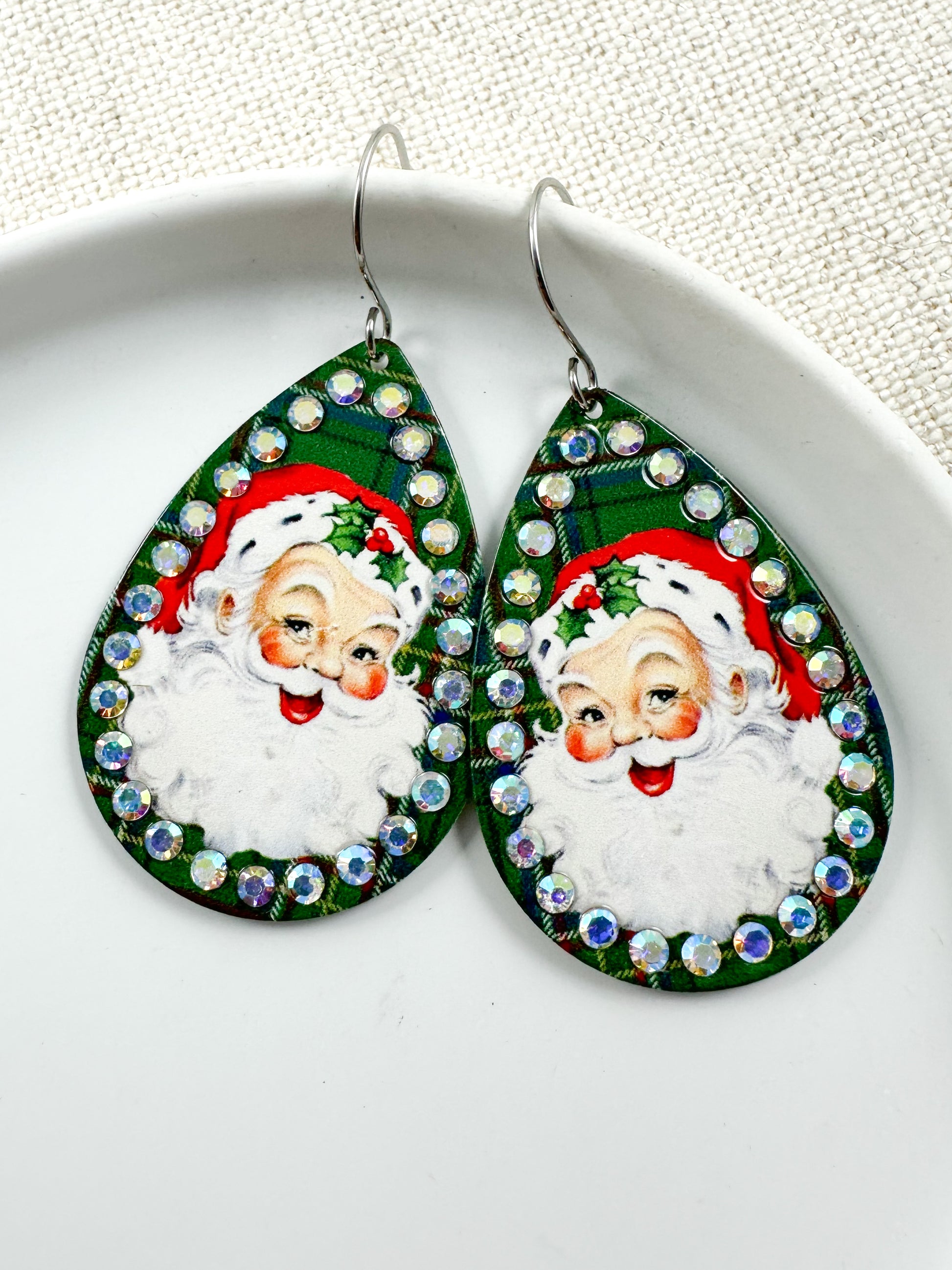 green plaid Santa earrings, metal teardrop earrings, vintage Santa face earrings, green holiday statement earrings, Christmas earrings with rhinestones, festive dangle earrings, bold holiday jewelry, retro Santa earrings, Christmas gift for women, 2 inch holiday earrings, Christmas party accessories, rhinestone Santa earrings, holiday fashion jewelry, green plaid earrings for Christmas, nostalgic holiday earrings, fun holiday earrings for teachers, Christmas earrings for moms, cute Santa earrings, trending holiday accessories, festive earrings with sparkle, metal Christmas earrings, Santa face earrings with bling, holiday earrings for gift exchange, cheerful Christmas earrings