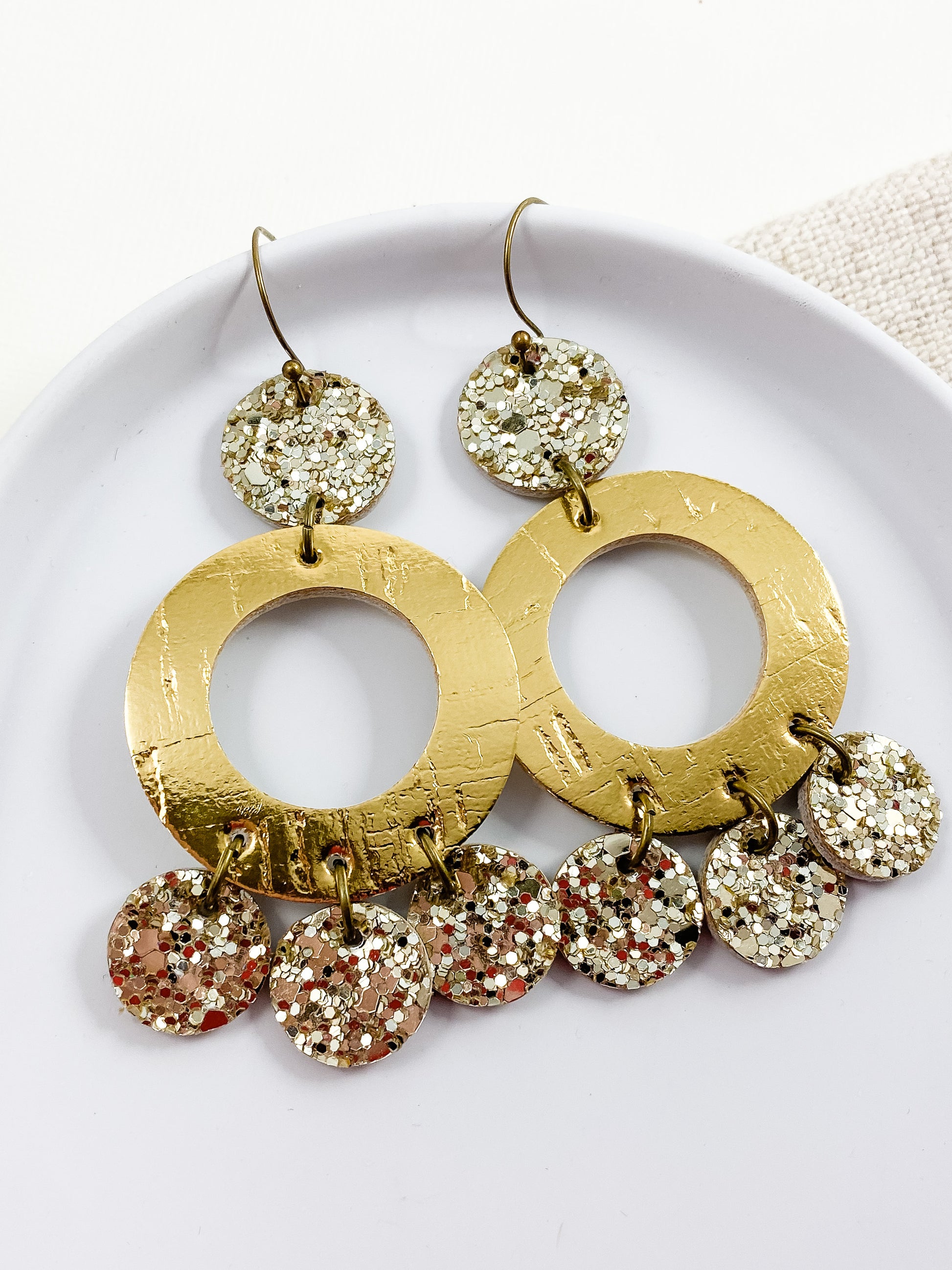 These earrings are such a statement! The circle chandelier style is so fun, and the sparkly metallic gold adds glamour. These dress up or down so easily. Dress them up for a party or special occasion, or throw them on with leggings and a comfy top to add a bit of extra!