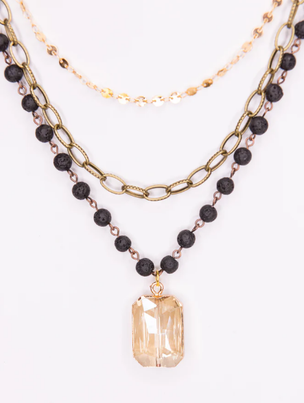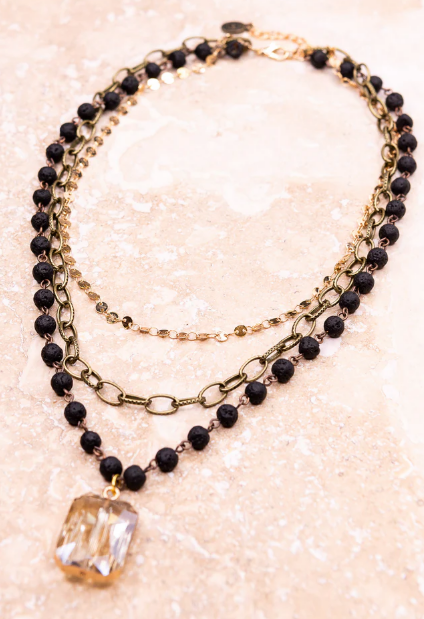 This multi-strand beauty is your go-to for when you want to make a statement without even trying. Layers of bronze and gold chains and a strand of dark beaded texture come together to create the perfect balance of edgy and sophisticated. And that crystal charm? It’s the cherry on top, catching the light like a little burst of magic.