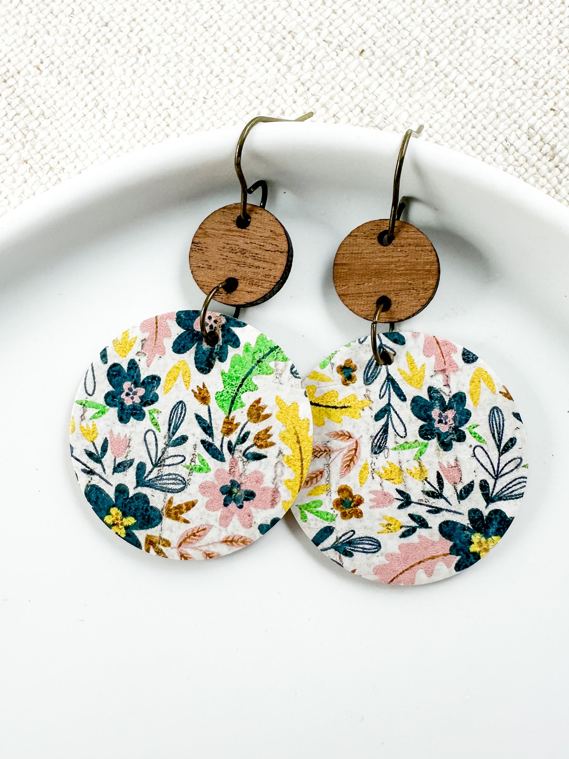 Dainty flowers in yellow, navy, blush pink, cognac, and green are perfection on a distressed creamy white background. Wood pieces are a beautiful compliment. These earrings will quickly become some of your favorite pieces that will pair so well with your year-round wardrobe.