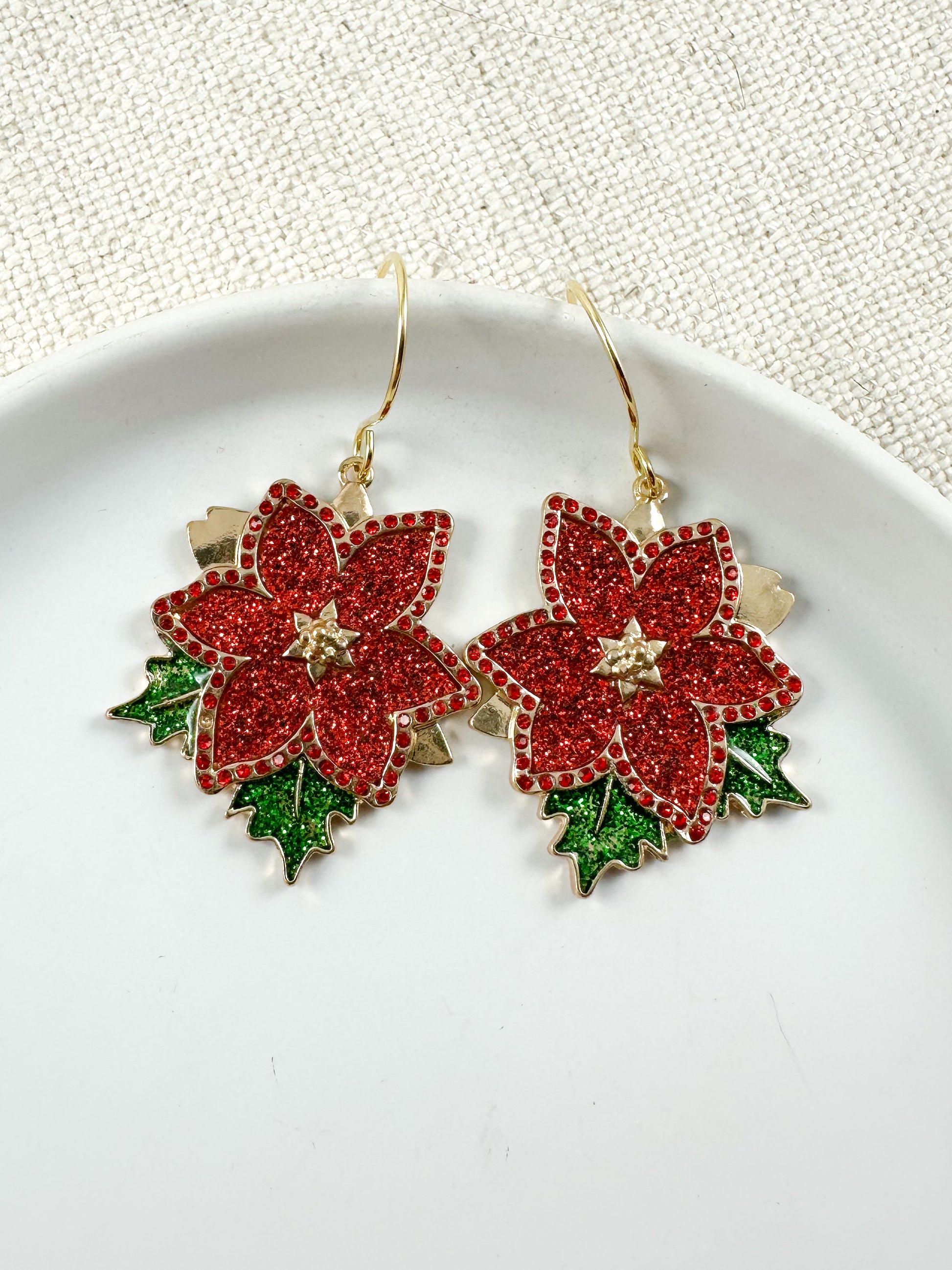 red poinsettia earrings, Christmas flower earrings, holiday floral earrings, glitter poinsettia drop earrings, red and green metal earrings, festive holiday earrings, lightweight Christmas earrings, statement holiday earrings, poinsettia jewelry, floral holiday dangle earrings, Christmas party earrings, gift for her Christmas, sparkly floral earrings, winter holiday earrings, Christmas bloom earrings, seasonal fashion earrings, poinsettia inspired jewelry, small drop festive earrings, floral themed Christmas earrings, holiday statement earrings