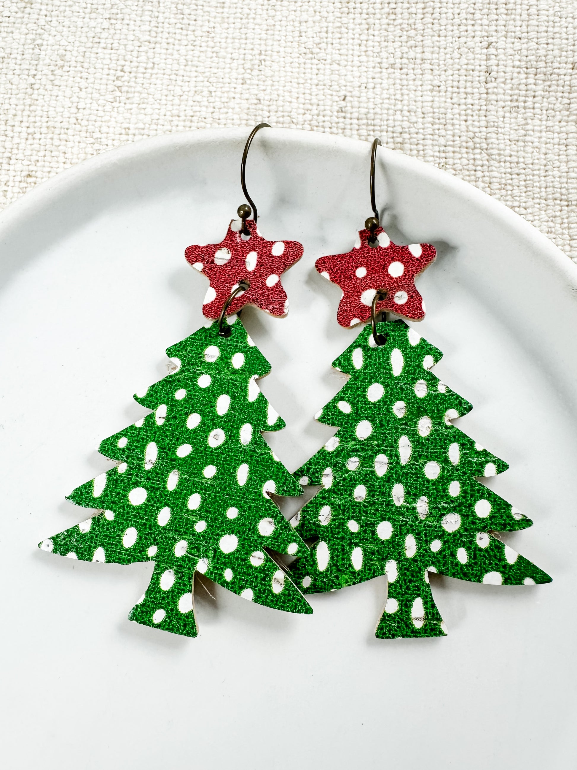 green Christmas tree earrings, polka dot tree earrings, handmade holiday earrings, red and green statement earrings, whimsical Christmas earrings, cork Christmas earrings, tree shape dangle earrings, lightweight Christmas jewelry, festive tree earrings, Christmas earrings for women, bold holiday earrings, unique holiday accessories, funny Christmas earrings, polka dot leather earrings, Christmas party earrings, tree silhouette earrings, large drop Christmas earrings, playful holiday earrings, holiday earrings for gifting, handmade quirky earrings, leather statement earrings, tree earrings with stars, green and white earrings, red star earrings, gift for earring lover, stocking stuffer earrings, festive earrings for teens, bold Christmas accessories, cute Christmas earrings, Christmas earring ideas for women