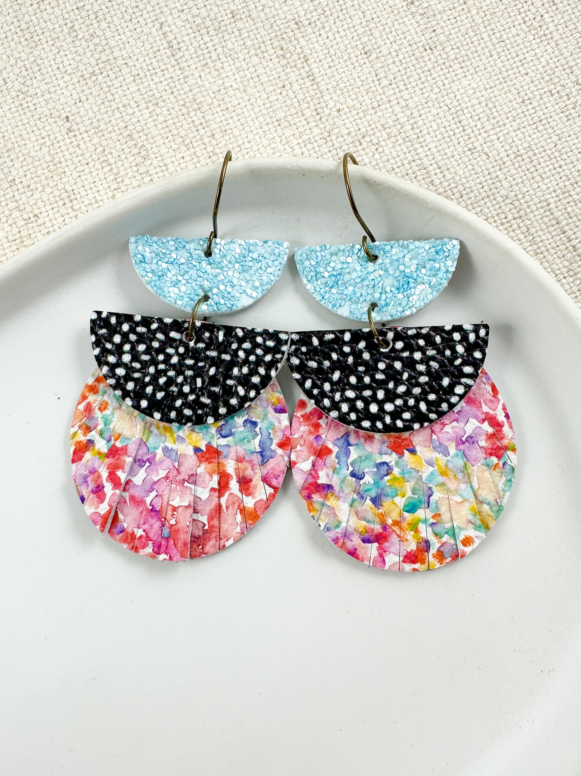 They’ve got layers — like, actual layers and personality layers. That sparkly sky blue on top? Total eye-catcher. The polka dot middle? A little unexpected, a little edgy. And then those rainbow watercolor vibes at the bottom? Full-on sunshine in earring form.