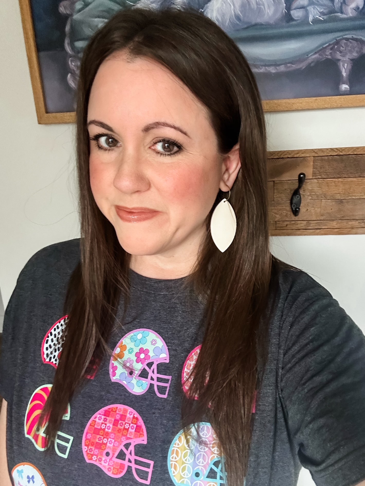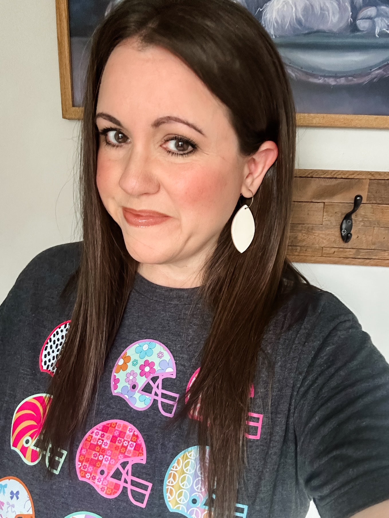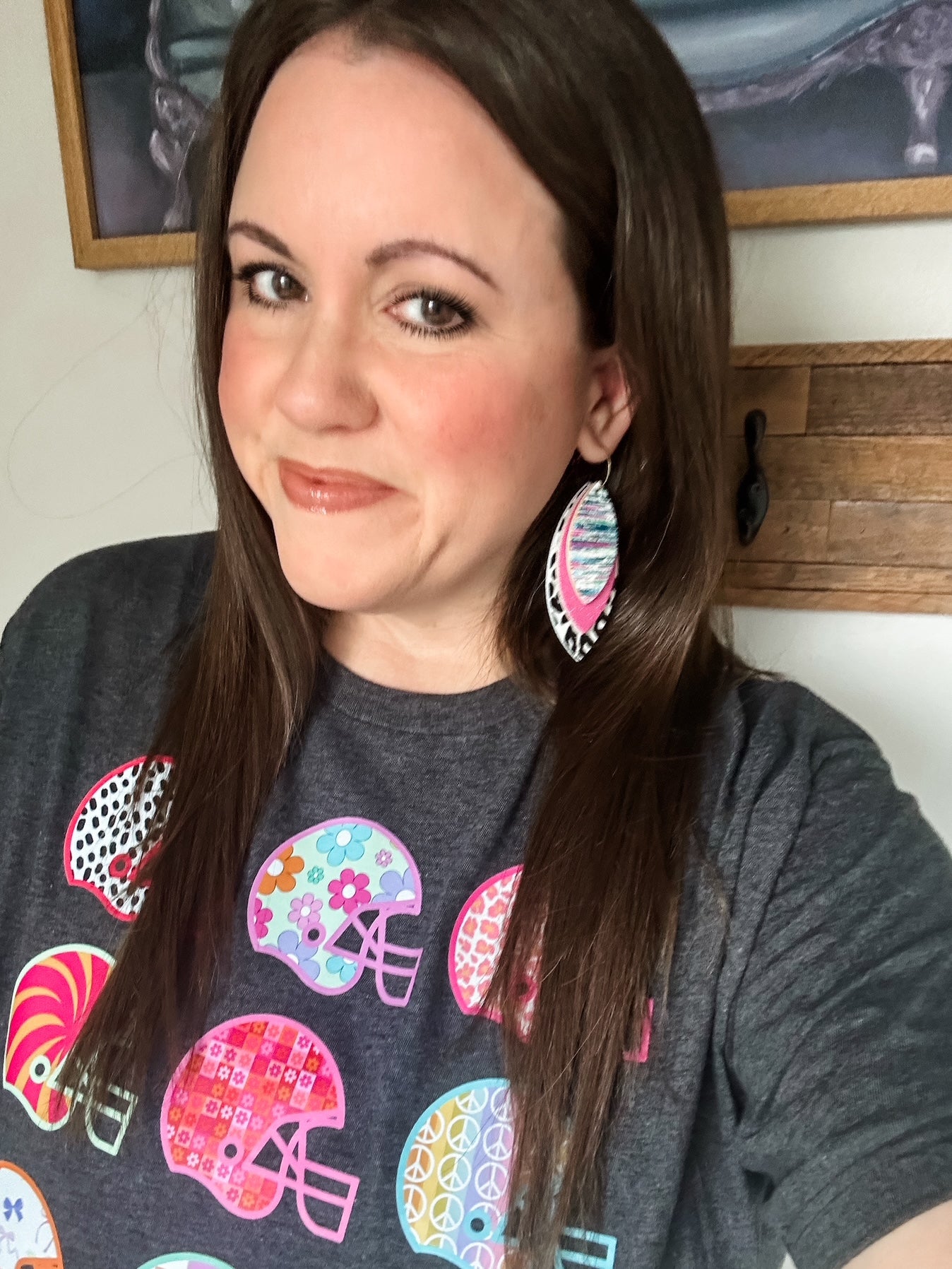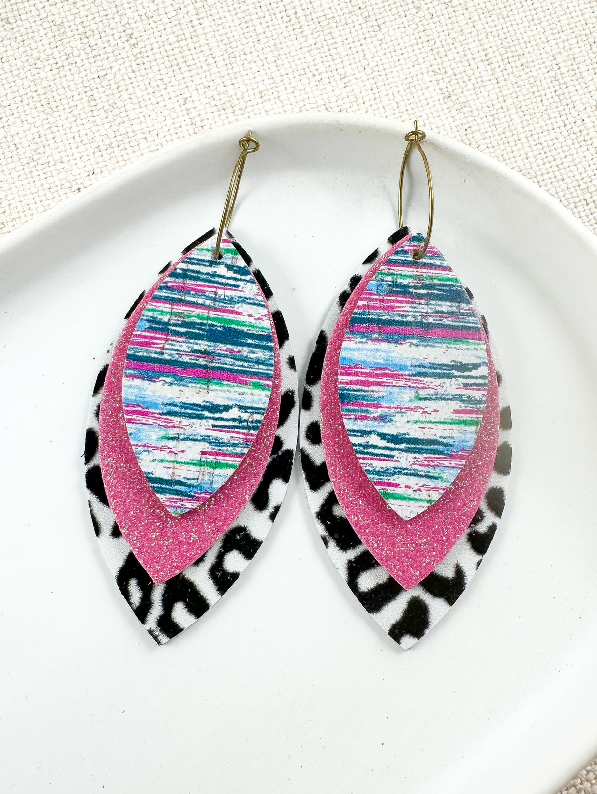 painted tracks earrings, mix and match hoop earrings, 7 ways to wear earrings, multi layer leather cork earrings, lightweight statement earrings, colorful brushstroke earrings, pink glitter layered earrings, black and white animal print earrings, large medium small drop earrings, versatile travel earrings for women, interchangeable hoop earrings, boutique leather earrings, unique sports mom earrings, game day statement earrings, handmade leather cork jewelry, bold patterned earrings, everyday lightweight earrings, fun colorful earrings for her, multi style hoop earrings, artisan leather earrings, trendy boutique earrings, adjustable layered earrings, three layer hoop earrings, womens fashion earrings versatile, stylish gift for her