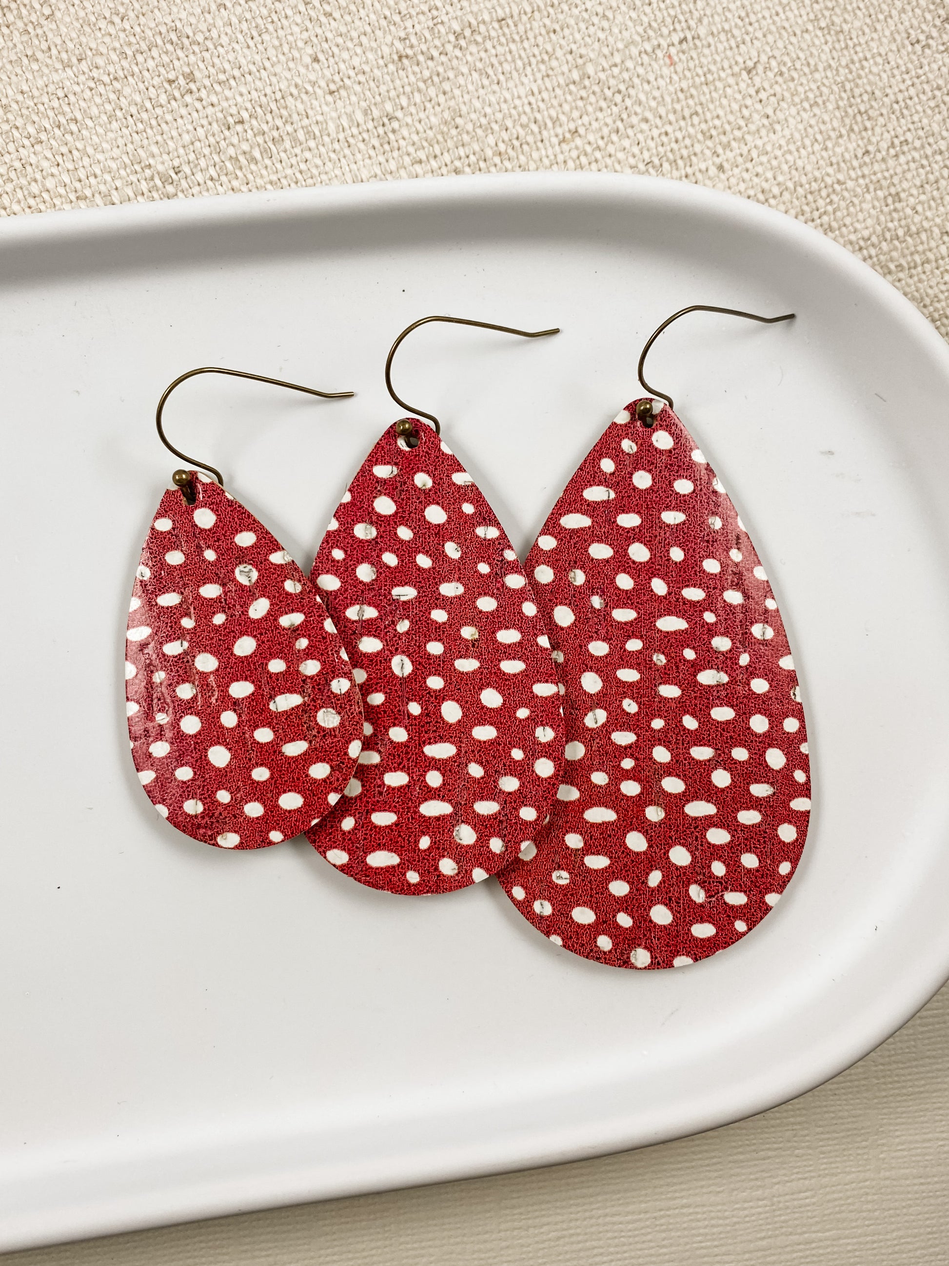 Red and white polka dot leather earrings are a MUST-HAVE for your wardrobe! These earrings are basics that you will wear all the time. You need them for everyday AND for holidays like Christmas, Fourth of July, and Valentine's Day, for ballgames and school spirit (Arkansas fan anyone??? baseball? football?), and for vacations!