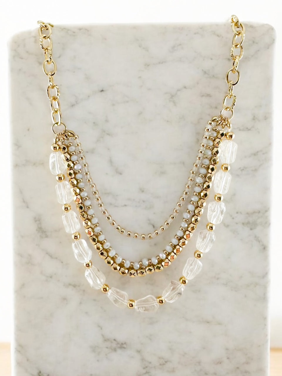 clear layered necklace, gold and clear beaded necklace, trendy chain link necklace, pearl and clear bead necklace, statement layered necklace, lightweight fashion necklace, chunky chain necklace women, clear jewelry trend necklace, everyday layering necklace, boutique necklace gold clear, gift for her necklace, wedding guest jewelry, modern chic necklace, elegant necklace for women, clear statement jewelry, layered necklace with extender, trendy clear gold necklace