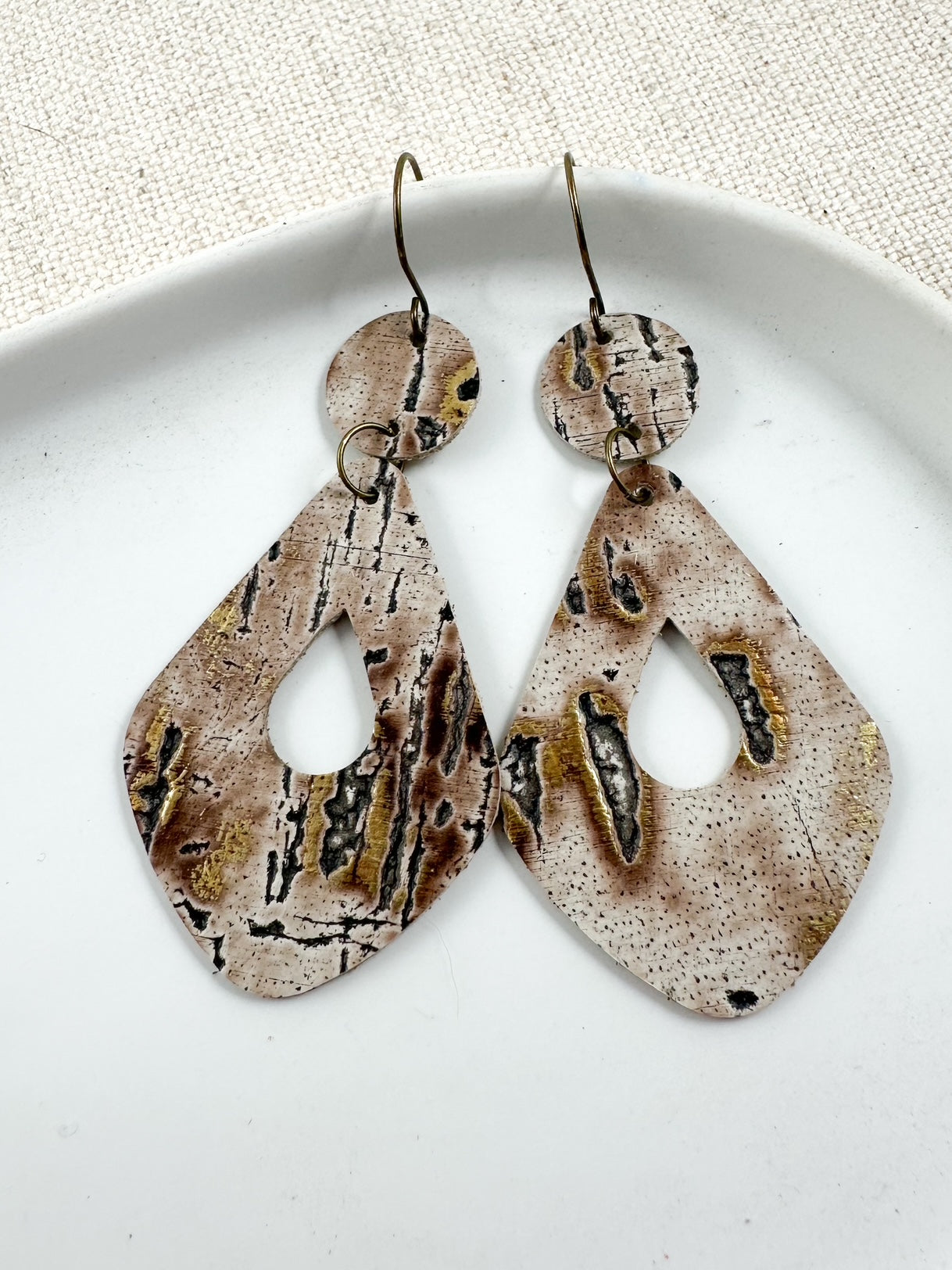Natural texture with a hint of golden glow. This genuine leather is soft taupe with bark-inspired woodgrain, etched black markings, and scattered flecks of gold — a cozy neutral that feels grounded, warm, and a little bit magical.
