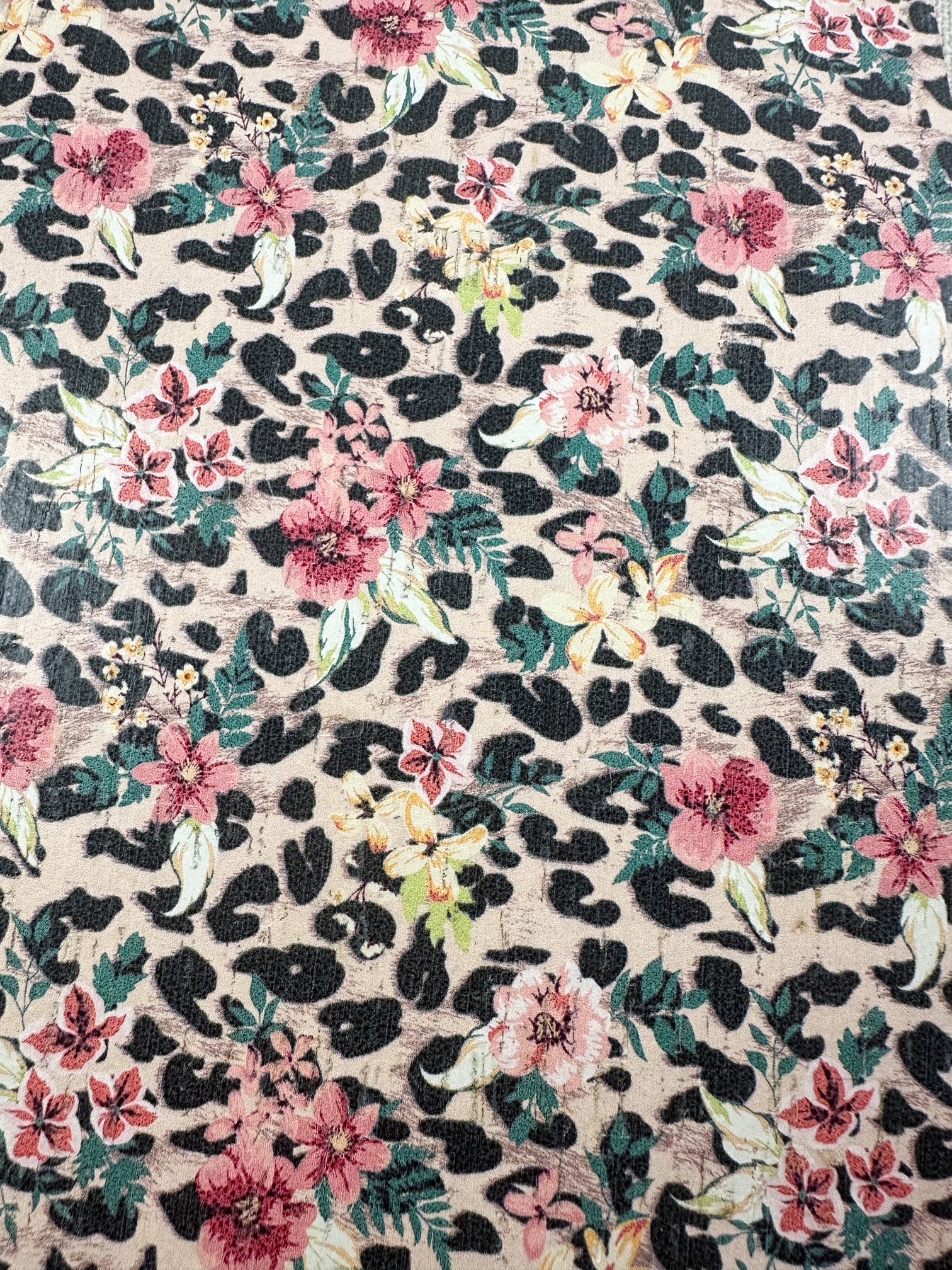 This cork is backed with genuine leather and features a mix of bold black leopard spots layered with soft, romantic florals. The neutral background lets the pops of rosy pink, cream, and forest green flowers shine. It’s equal parts edgy and elegant—like a power outfit with a touch of perfume.