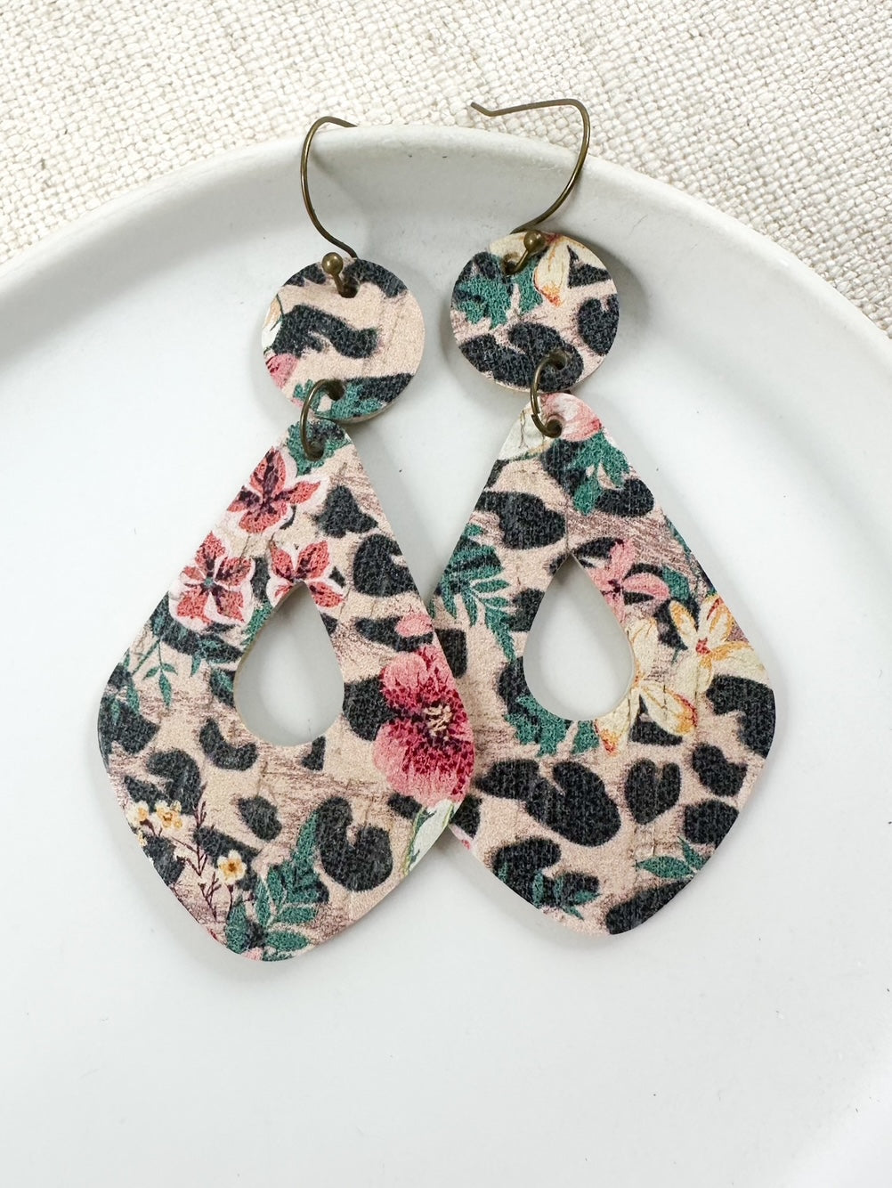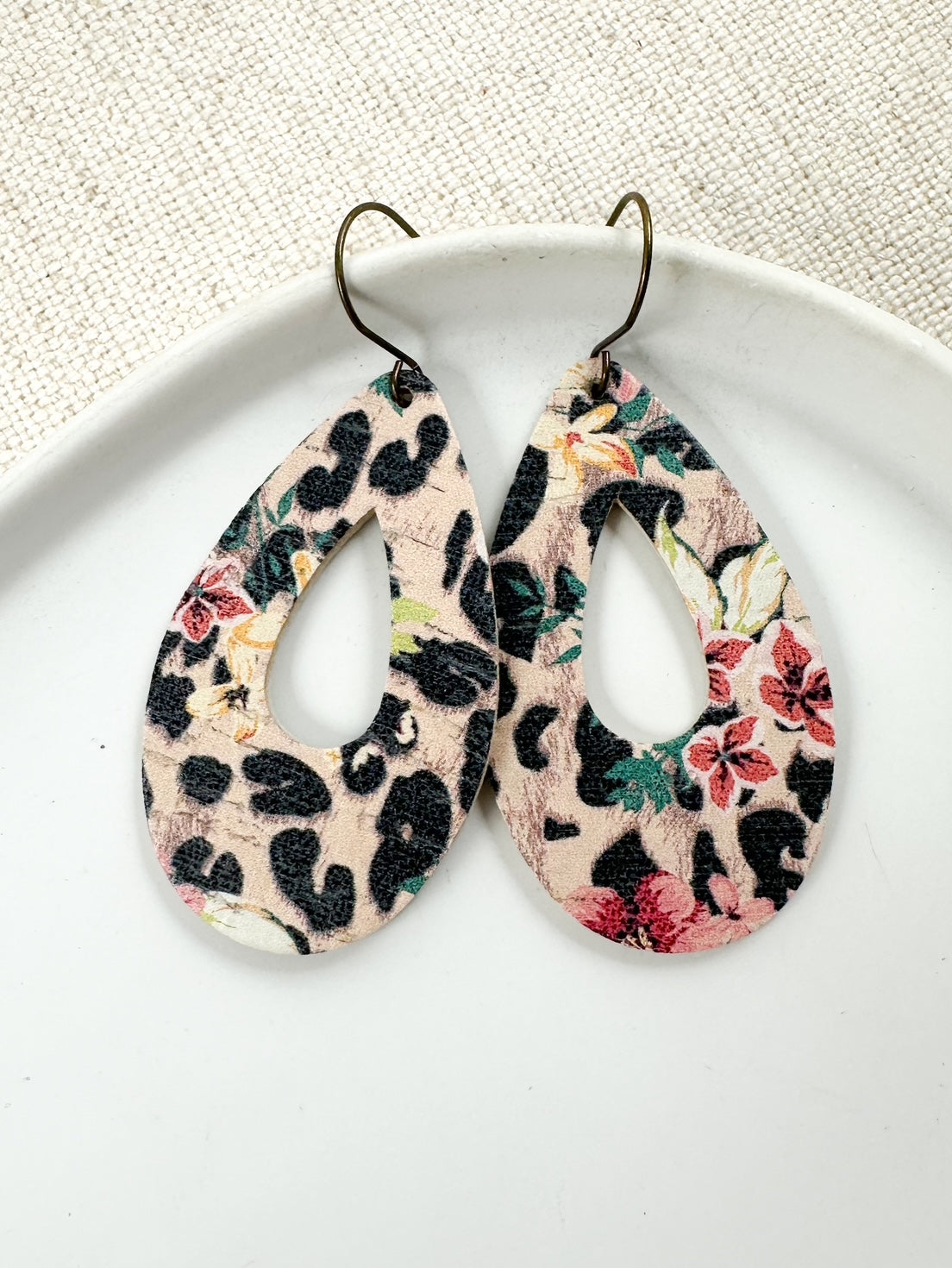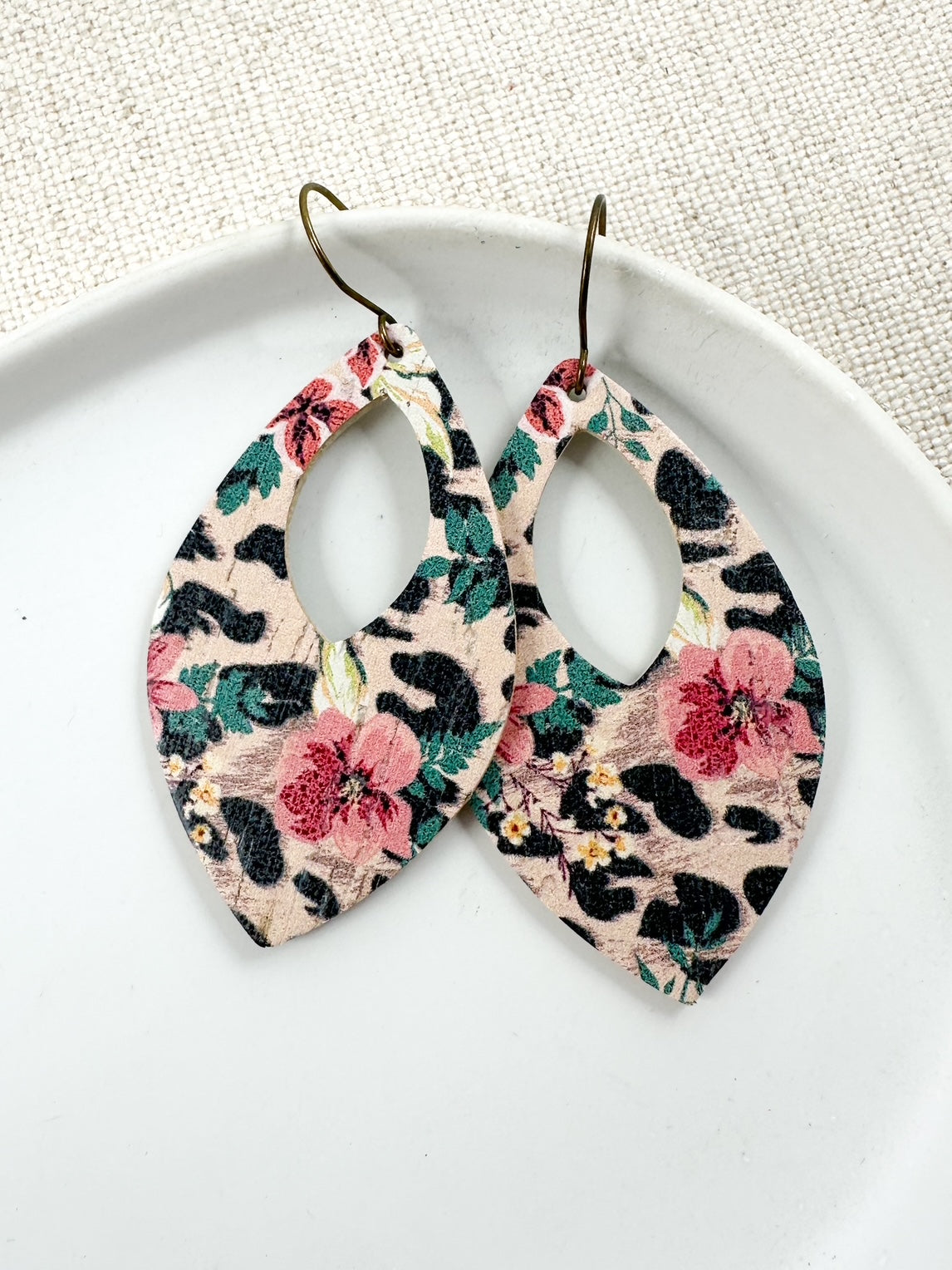 floral leopard print earrings, neutral floral cork earrings, wildflower animal print earrings, leopard and rose earrings, savage floral earrings, edgy floral earrings, pink and black earrings, handmade cork earrings, leather-backed cork earrings, bold floral earrings, floral statement earrings, boutique animal print earrings, lightweight cork earrings, boho floral earrings, romantic wild earrings, mixed print earrings, floral animal print jewelry, small business statement earrings, floral cork earrings for women, fierce floral earrings, pink wildflower earrings, floral earrings with edge, unique cork earrings, trendy boutique earrings, custom shape cork earrings, neutral earrings with floral accents, soft and wild earrings