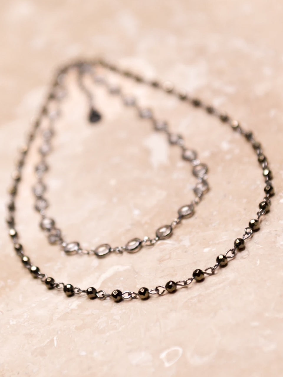 gunmetal hematite necklace, clear bead layered necklace, double strand statement necklace, edgy gunmetal jewelry, hematite chain link necklace, layered clear crystal necklace, silver and clear beaded necklace, modern minimalist layering necklace, dark metal and crystal jewelry, versatile 18 inch necklace with extender, trendy mixed metal necklace, high fashion gunmetal jewelry, elegant hematite chain necklace, lightweight double strand necklace, crystal puff bead necklace, polished hematite statement necklace, clear gemstone fashion necklace, chic silver-tone layered necklace, edgy glam statement necklace, hematite and glass bead jewelry, refined industrial style necklace, fashion-forward gunmetal layering piece, delicate crystal bead necklace, luxe hematite jewelry for layering, classic yet modern statement necklace, mixed texture fashion necklace, evening wear statement necklace, contemporary dark metal jewelry, neutral-toned elegant necklace, cool-toned fashion accessory, unique beaded layering necklace, high-end style clear bead necklace, oxidized metal and crystal necklace, sophisticated hematite and clear necklace, silver-tone layered statement piece, trendy geometric bead necklace, must-have mixed metal jewelry, urban glam layering necklace, polished hematite crystal jewelry, sleek and modern necklace for gifting