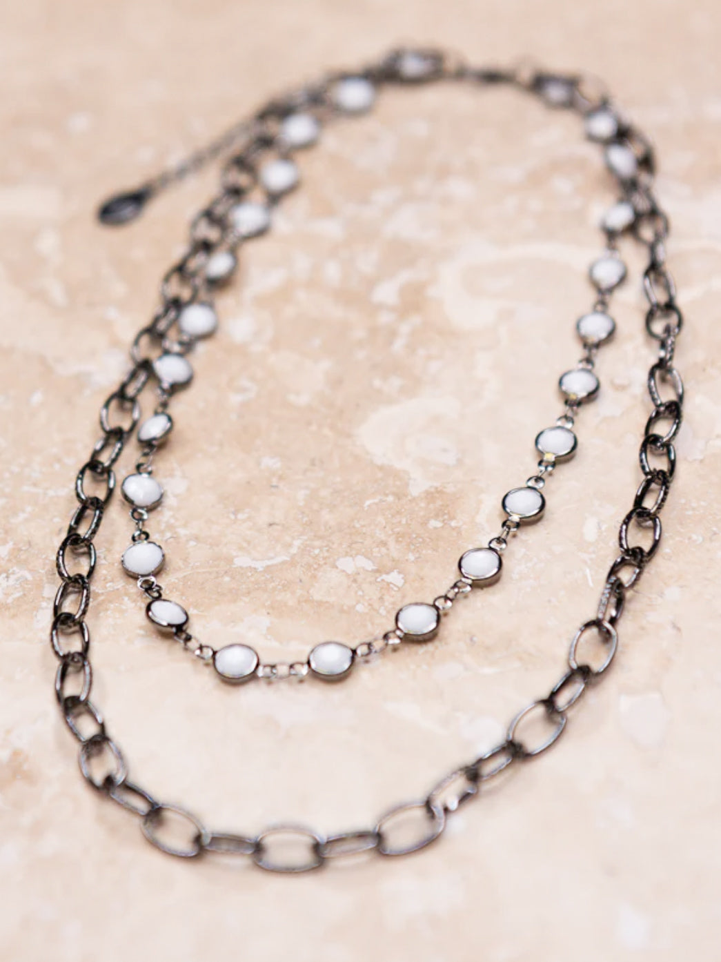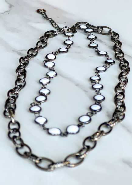 Double strand necklace featuring white puff beads and a thick gunmetal hematite chain link strand
