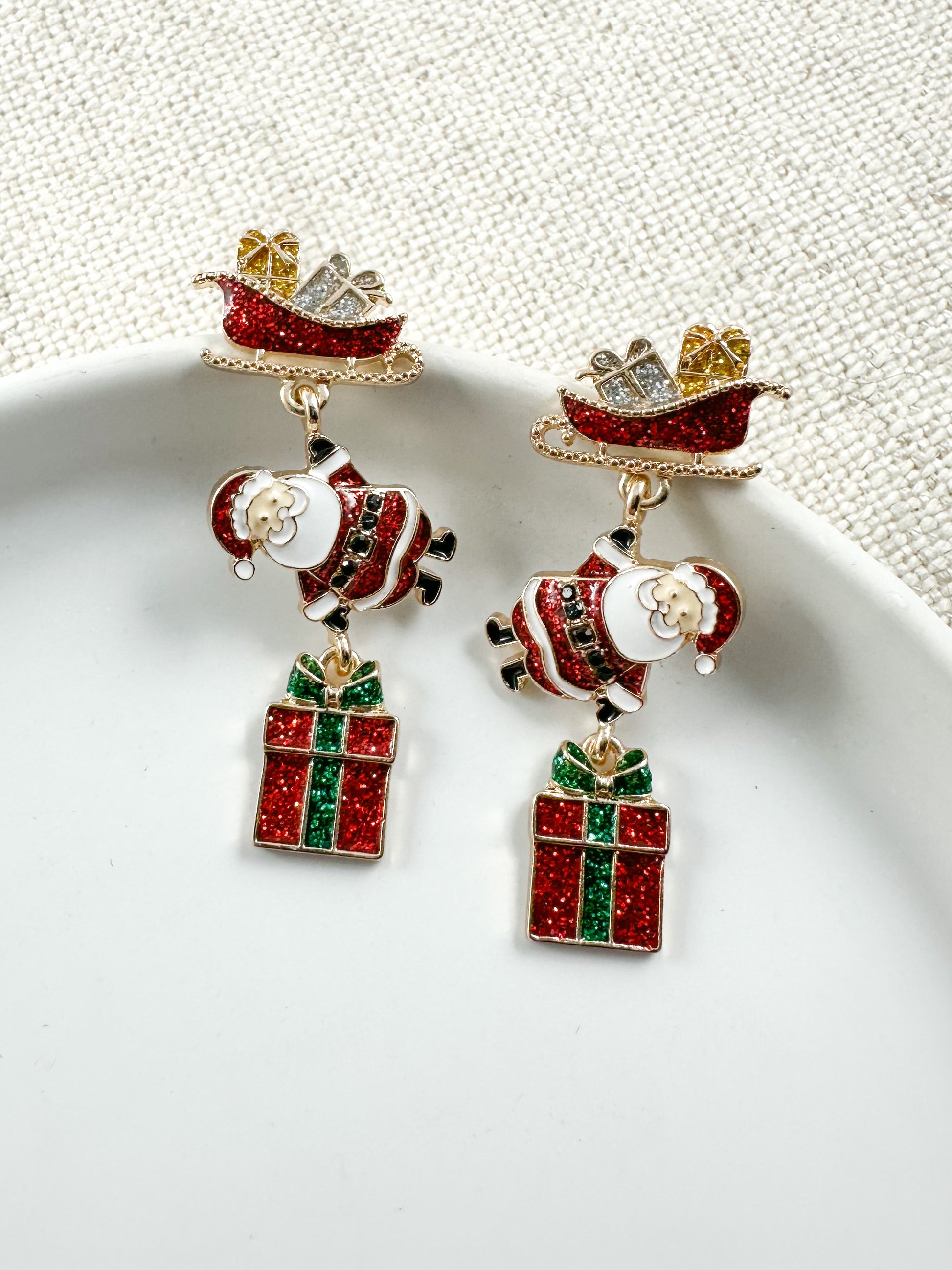 red and green Christmas earrings, Santa sleigh earrings, holiday sleigh jewelry, festive gift earrings, Santa charm earrings, Christmas present dangle earrings, whimsical holiday earrings, Christmas party accessories, holiday themed jewelry, Santa and gift drop earrings, stocking stuffer for her, secret Santa gift ideas, fun holiday earrings, glitter Christmas earrings, enamel Santa earrings, holiday earrings for teachers, kids Christmas gift ideas, holiday jewelry for women, novelty Christmas earrings, bold red green earrings, 1.75 inch holiday earrings, lightweight Christmas earrings, cute Santa earrings, holiday jewelry gift under $20, funny holiday earrings, womenās Christmas earrings, holiday earrings for moms, teacher Christmas gift earrings, festive outfit accessories, holiday earrings with sparkle