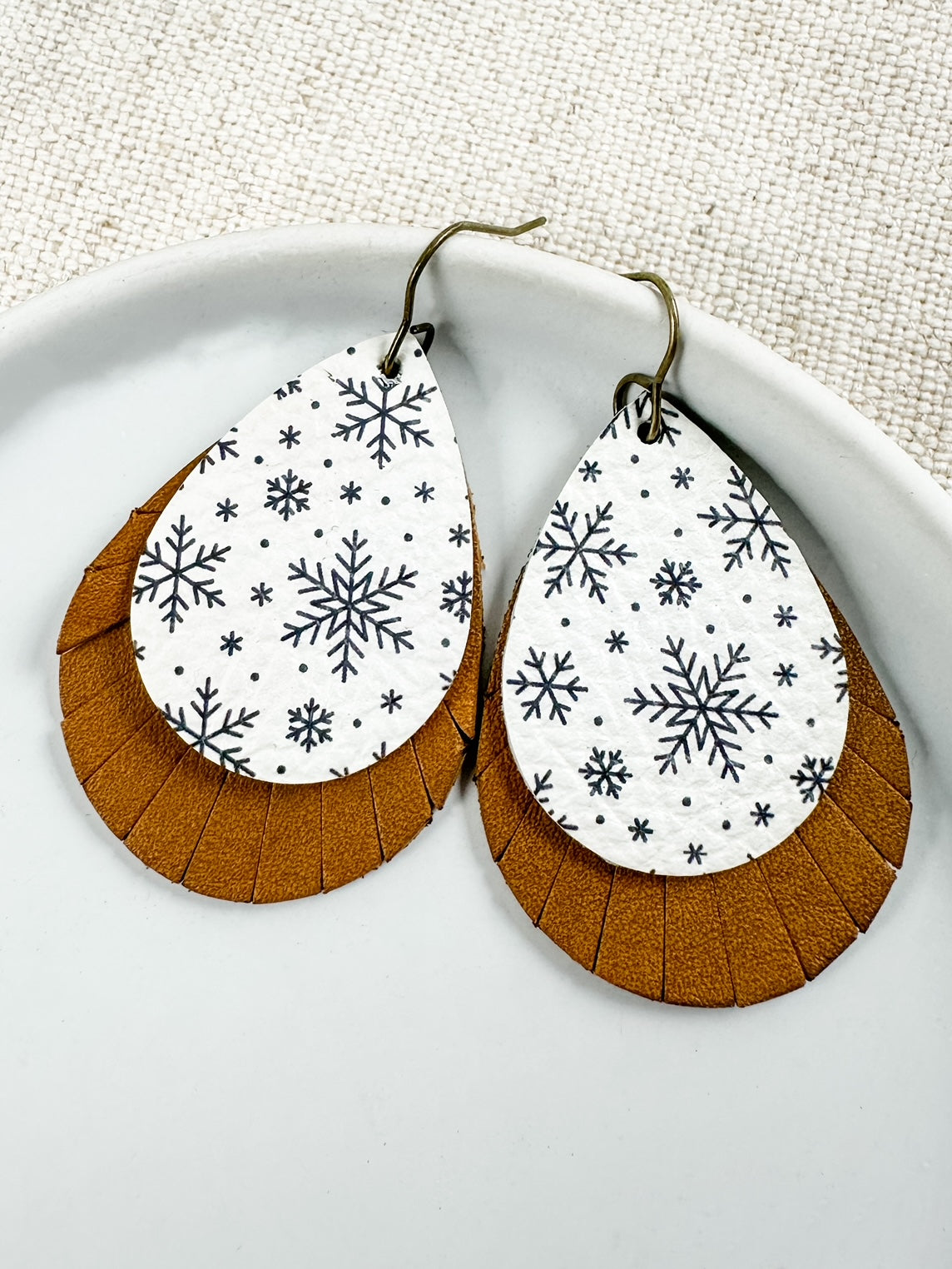 neutral snowflake leather earrings, brown and white teardrop earrings, winter statement earrings, holiday snowflake jewelry, rustic leather earrings, farmhouse Christmas earrings, boho winter earrings, genuine leather teardrop earrings, handmade lightweight earrings, cozy neutral holiday accessories, western style winter earrings, snowflake print earrings, layered leather earrings, Christmas gift earrings, winter birthday gift earrings, stocking stuffer earrings, festive holiday earrings, snowy woods inspired jewelry, winter neutral earrings, neutral winter outfit accessories