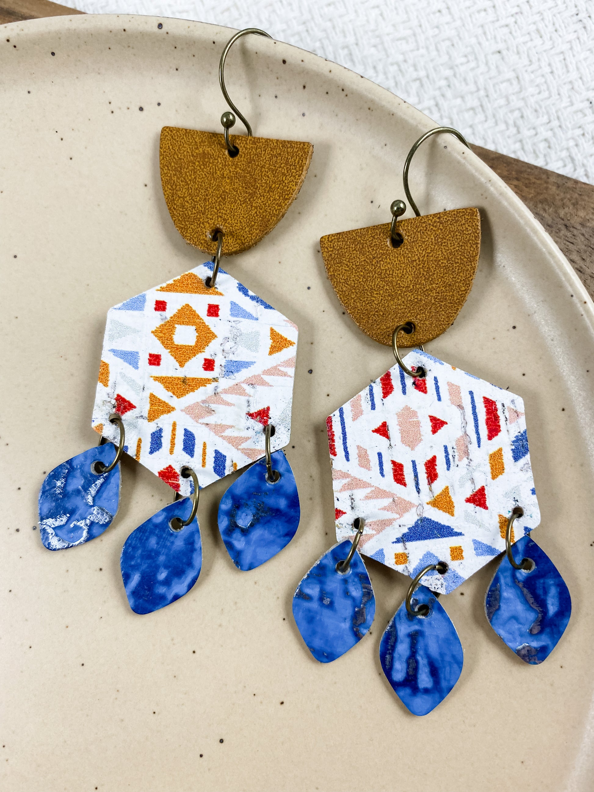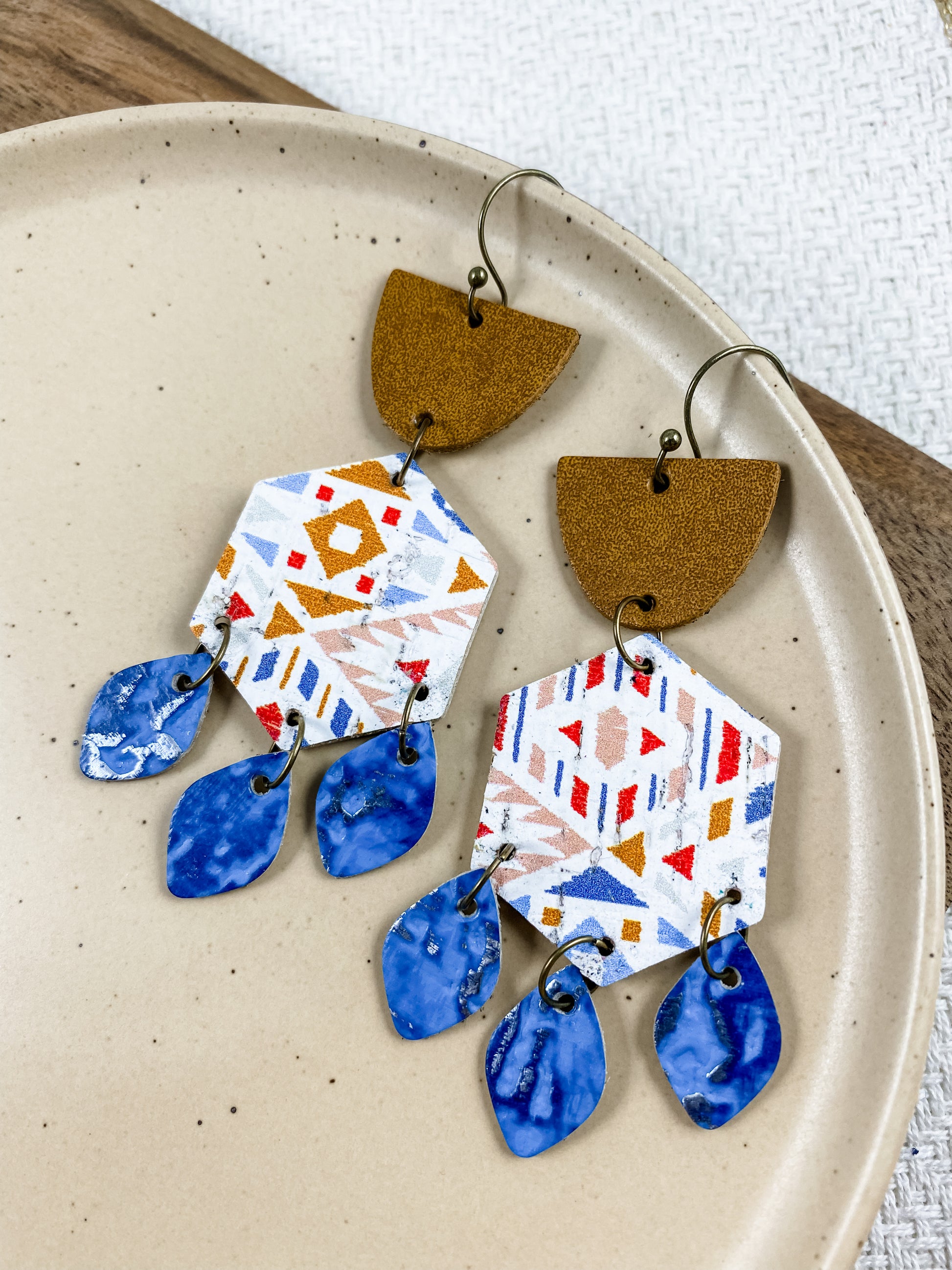 A statement earring that's neutral enough to wear all the time?? Yes, you CAN have the best of both worlds! These Southwest Hexagon Chandeliers earrings come in a gorgeous neutral color palette with just a pop of color that will coordinate with half your closet. The cognac leather and denim blue dangles compliment the modern southwest print perfectly.