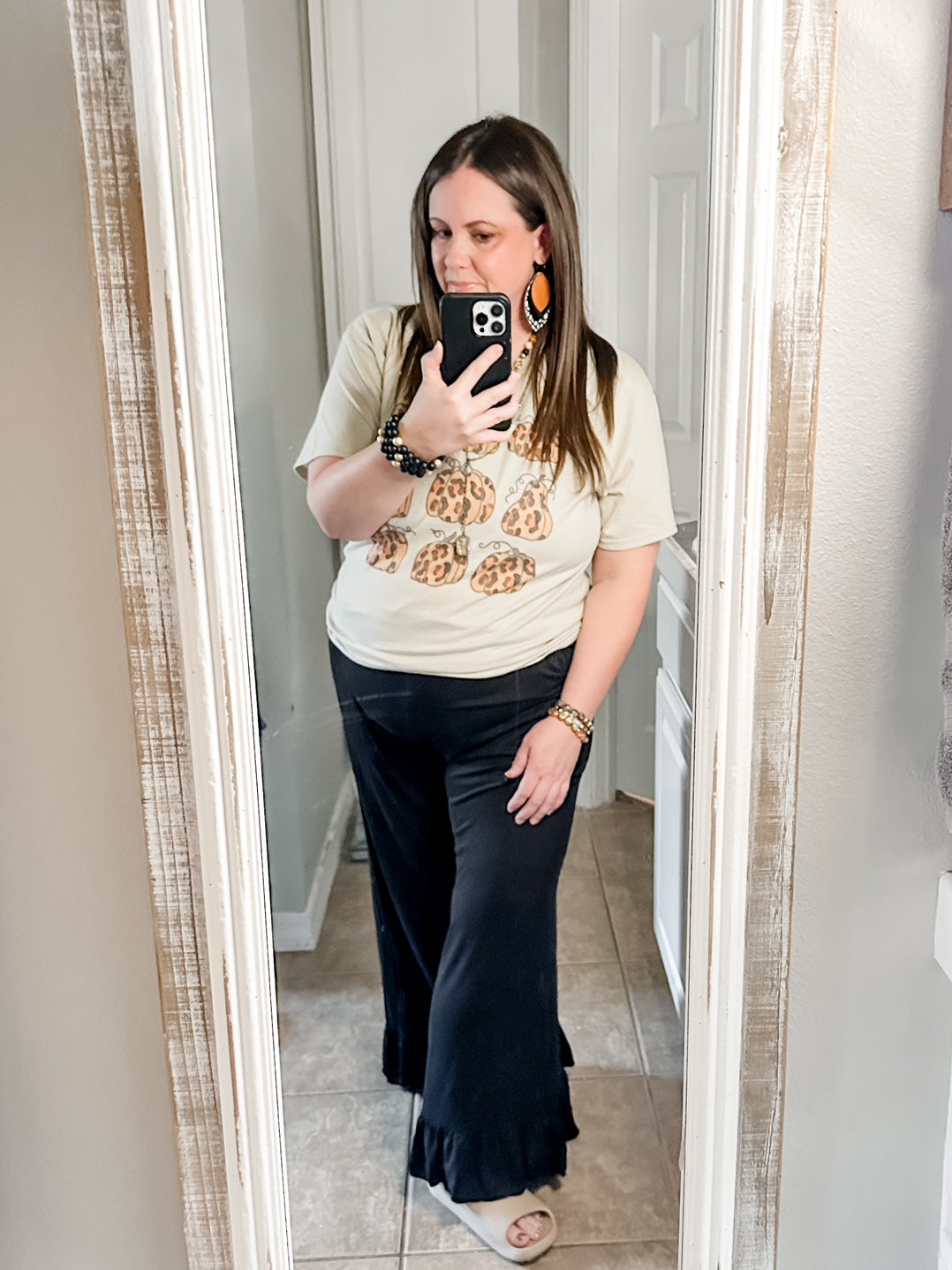 Pumpkin spice may get the spotlight, but the Spotted Orchard Tee deserves a moment too. Classic pumpkins get a leopard-print upgrade, bringing just the right amount of fun to your fall lineup. The creamy backdrop makes it a neutral you’ll actually reach for again and again.