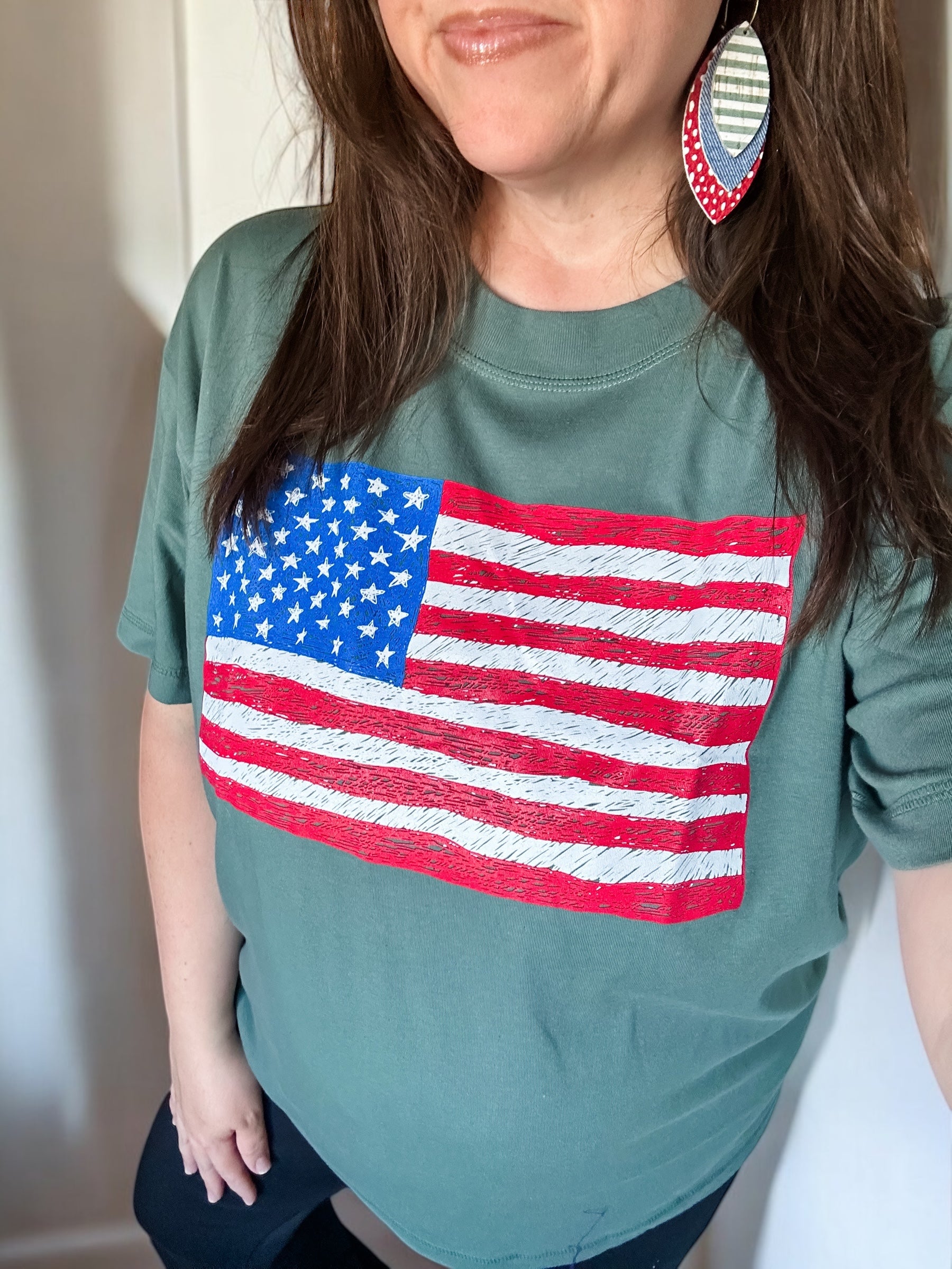 olive green flag tee, hand drawn american flag shirt, patriotic graphic tee, fourth of july outfit idea, women’s boyfriend fit t-shirt, relaxed fit usa tee, americana summer tee, casual independence day shirt, non cropped oversized tee, olive green usa tee, cute 4th of july shirt for women, gift for patriotic mom, boho country flag tee, soft cotton usa shirt, weekend barbecue outfit, women’s july 4th graphic tee, summer shirt with flag print, heartland inspired tee, rural america aesthetic shirt, vintage americana t-shirt, flag tee with relaxed fit, patriotic shirt for layering, flag tee for fireworks night, trendy july 4th shirt, red white and blue shirt for women